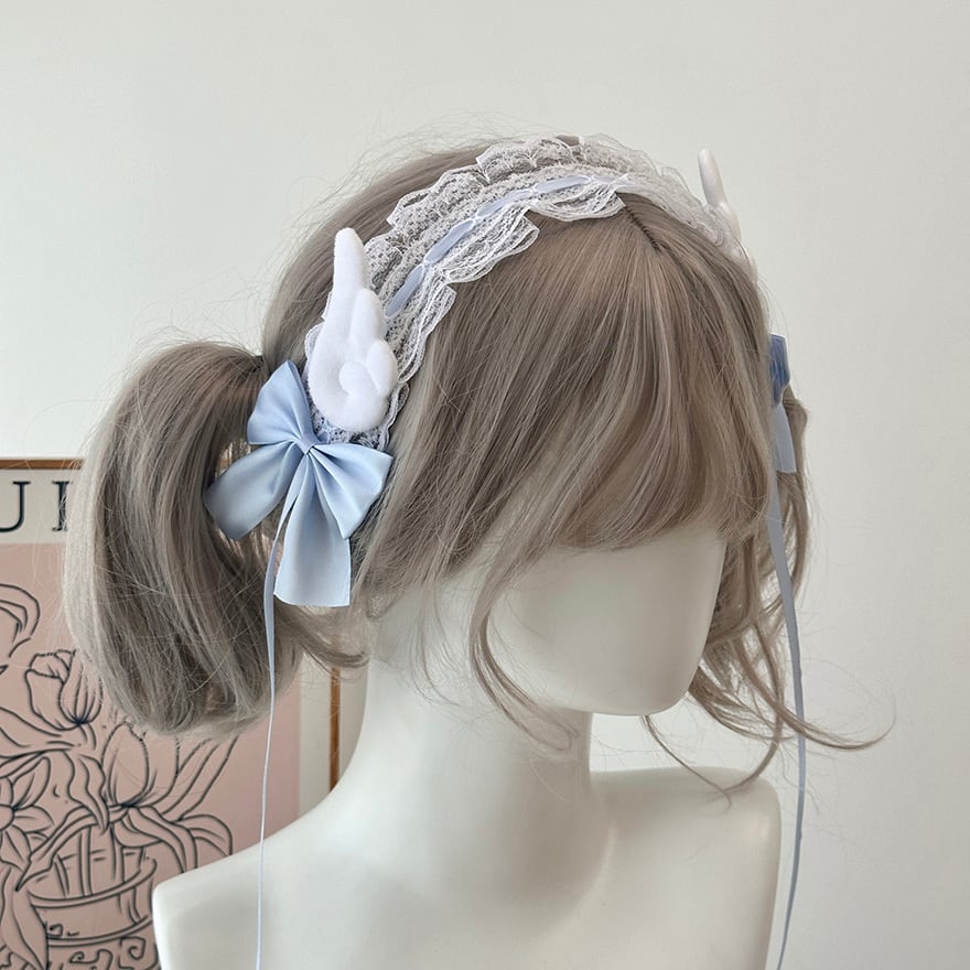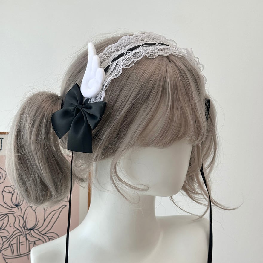 白い羽は、天使のものか、それとも悪魔が落とした羽根か――頭に纏うだけで、あなたの「好き」が頭上から溢れ出す。白レースと黒リボンの矛盾した甘辛が、あなた自身の世界観そのものを表現する。推し活の日も、ライブの夜も、このカチューシャがコーデの物語を完成させてくれる。