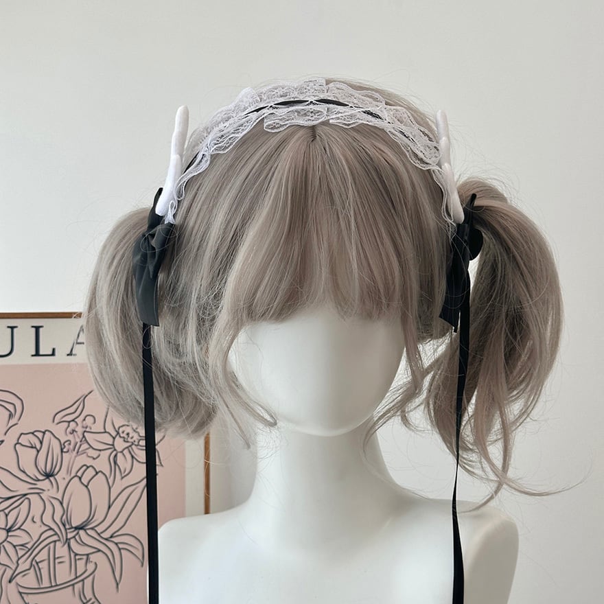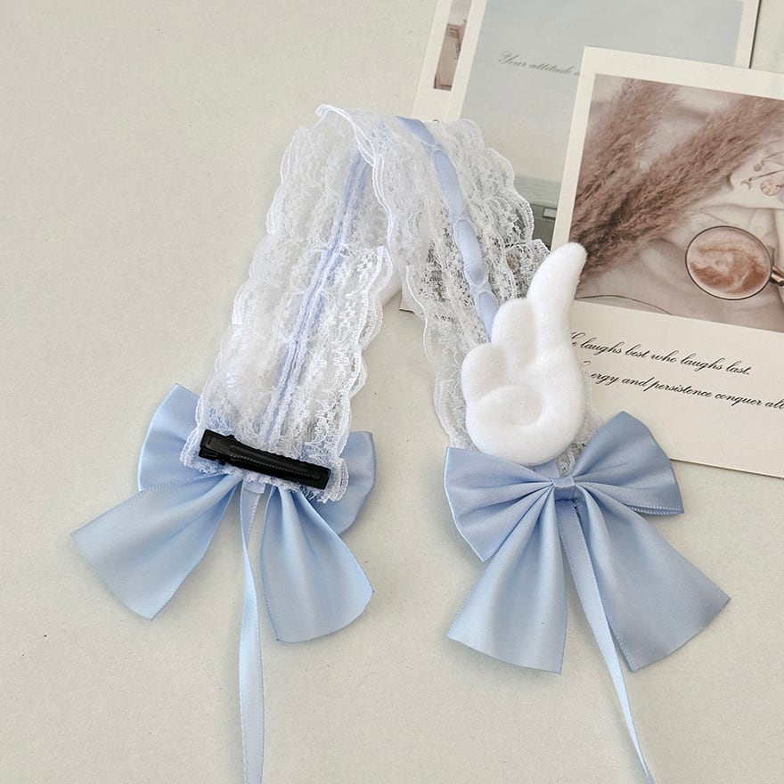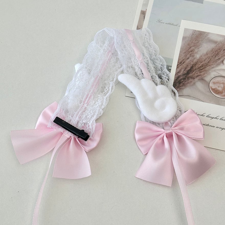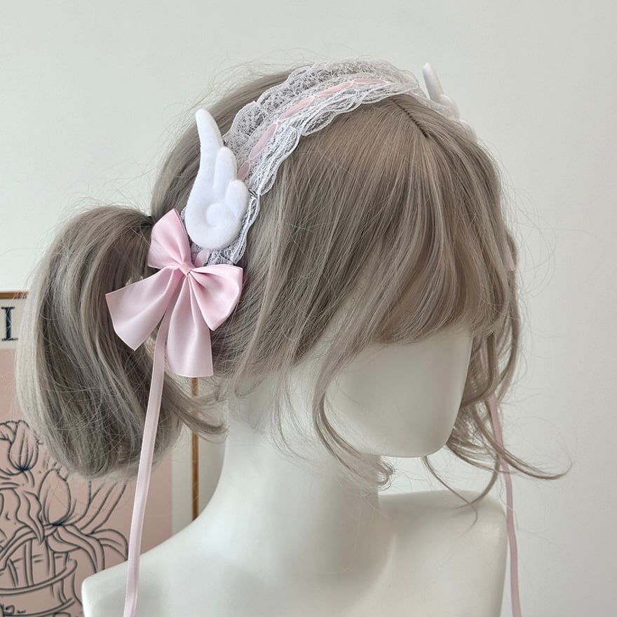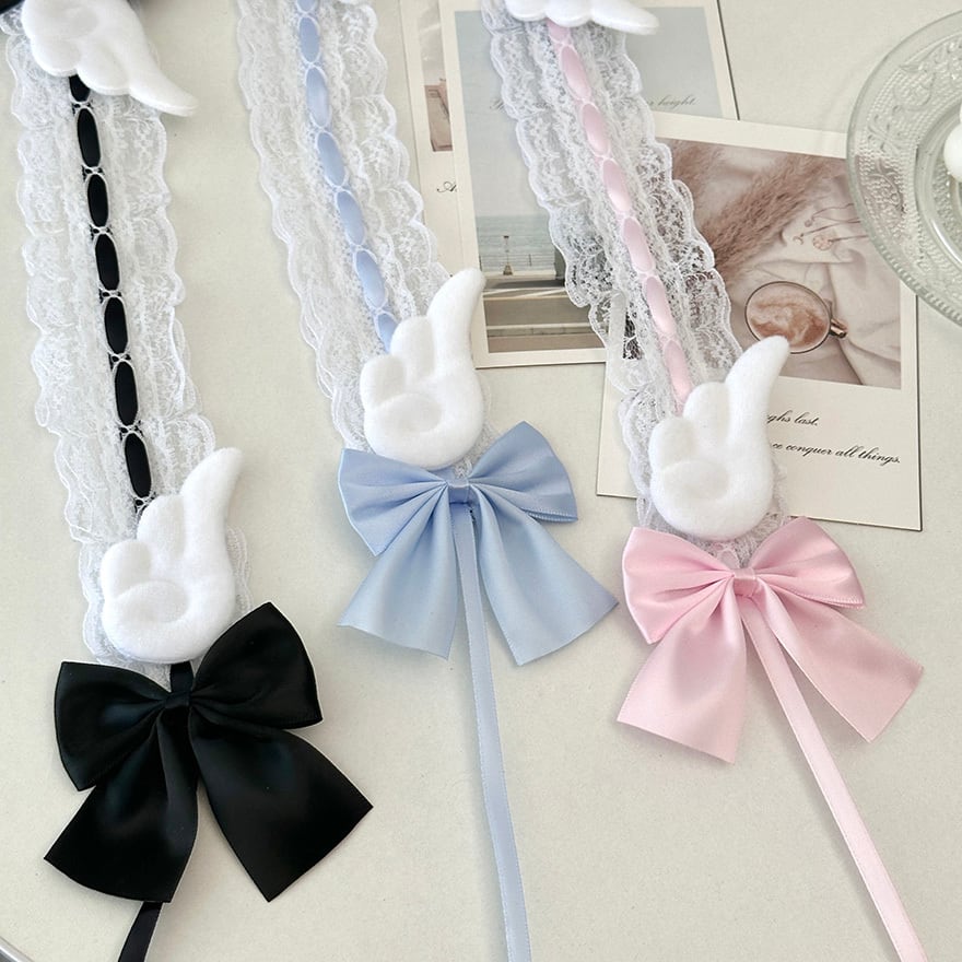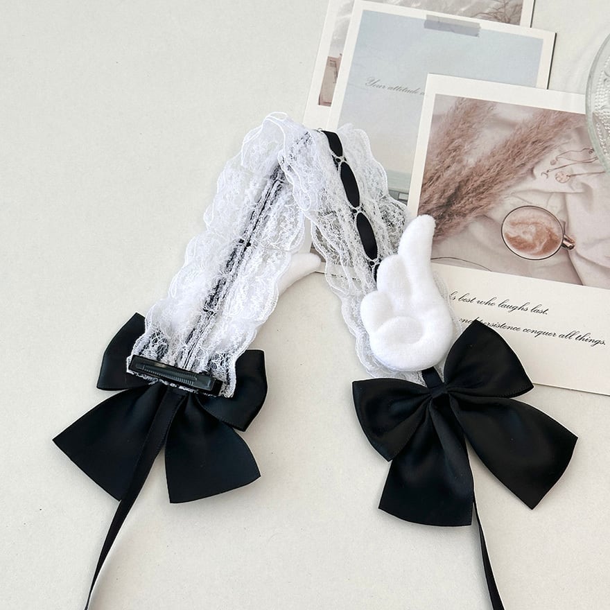 白い天使の羽モチーフと白レースフリル×黒リボンの甘辛ミックスが特徴で、推し活イベントやTikTokコーデ撮影でヘアアクセひとつから世界観を完成させられます。垂らしたブラックリボンがゆれるたびに病みかわいい存在感を放ち、コーデの仕上げに「これだ」と沼落ちさせる一点です。