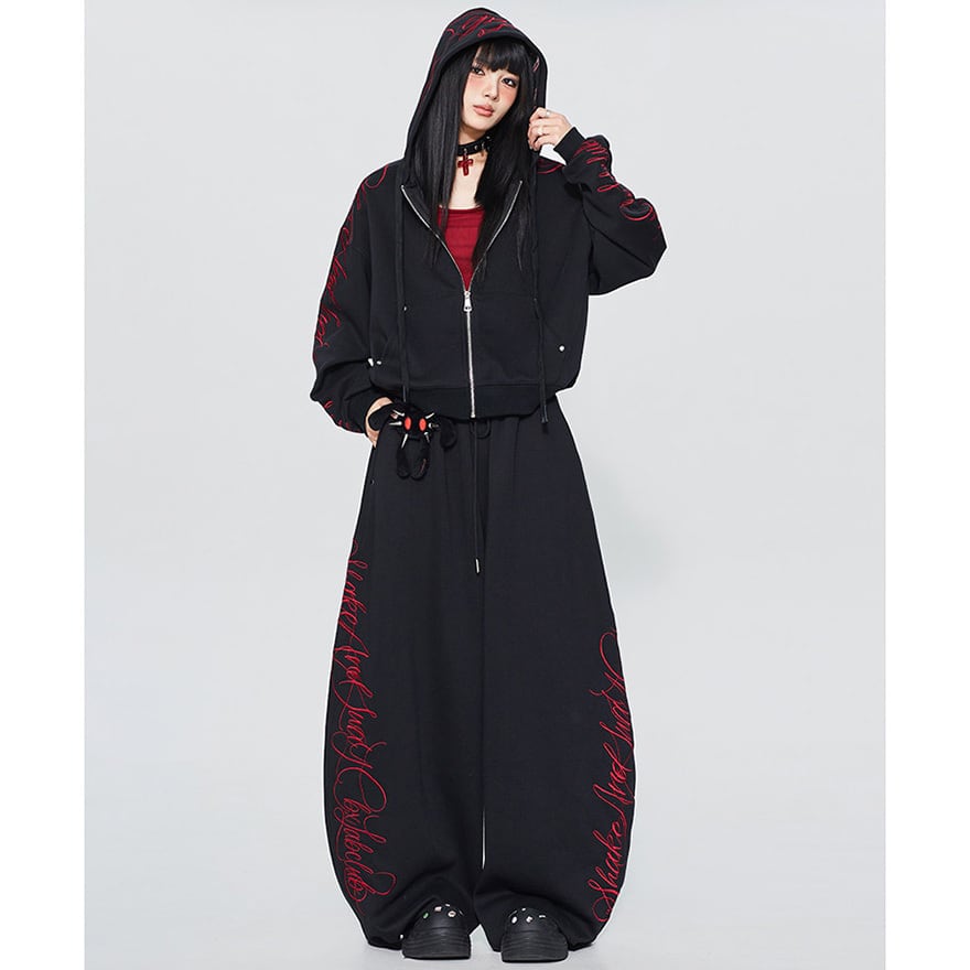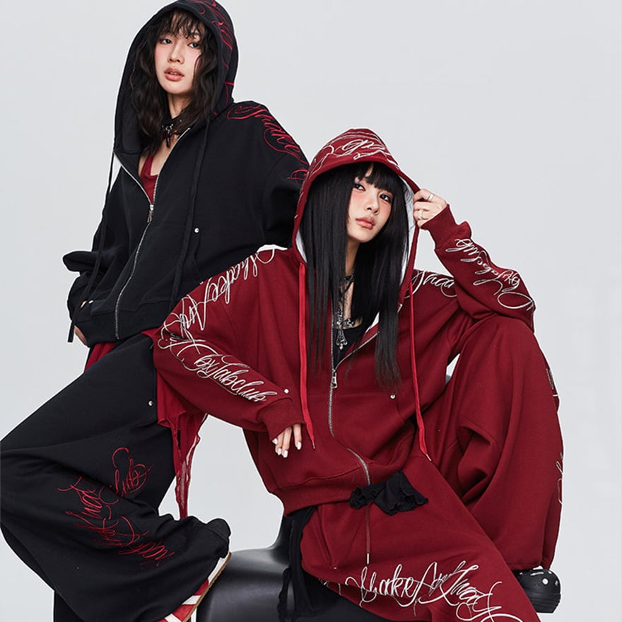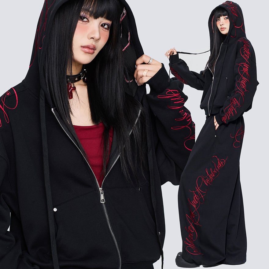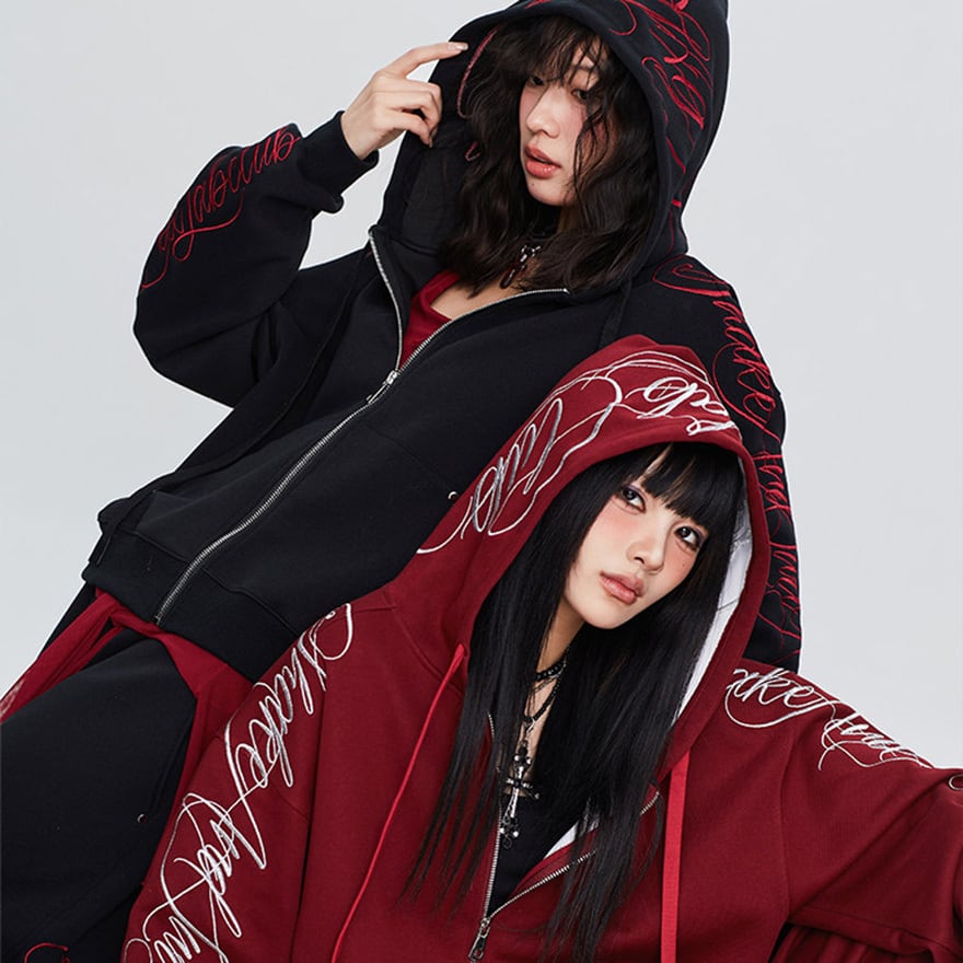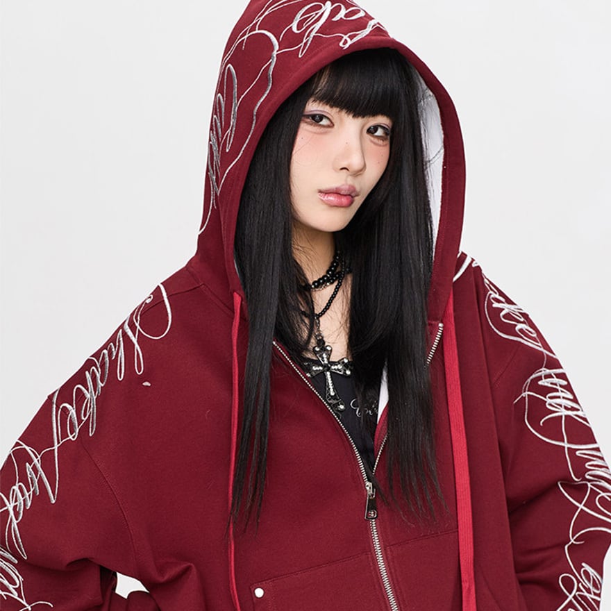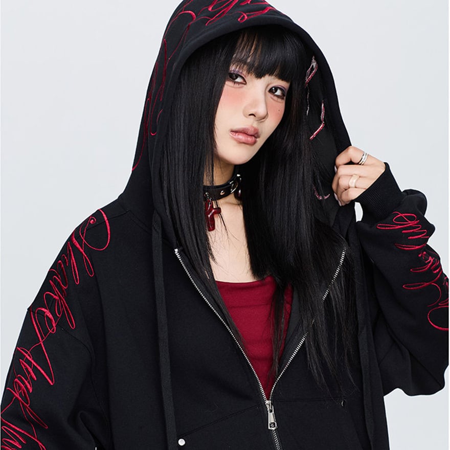 フードや袖に施された亮糸(光沢糸)による流麗な刺繍デザインが特徴で、Y2Kやストリートファッションに適しています。