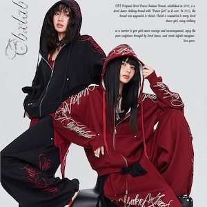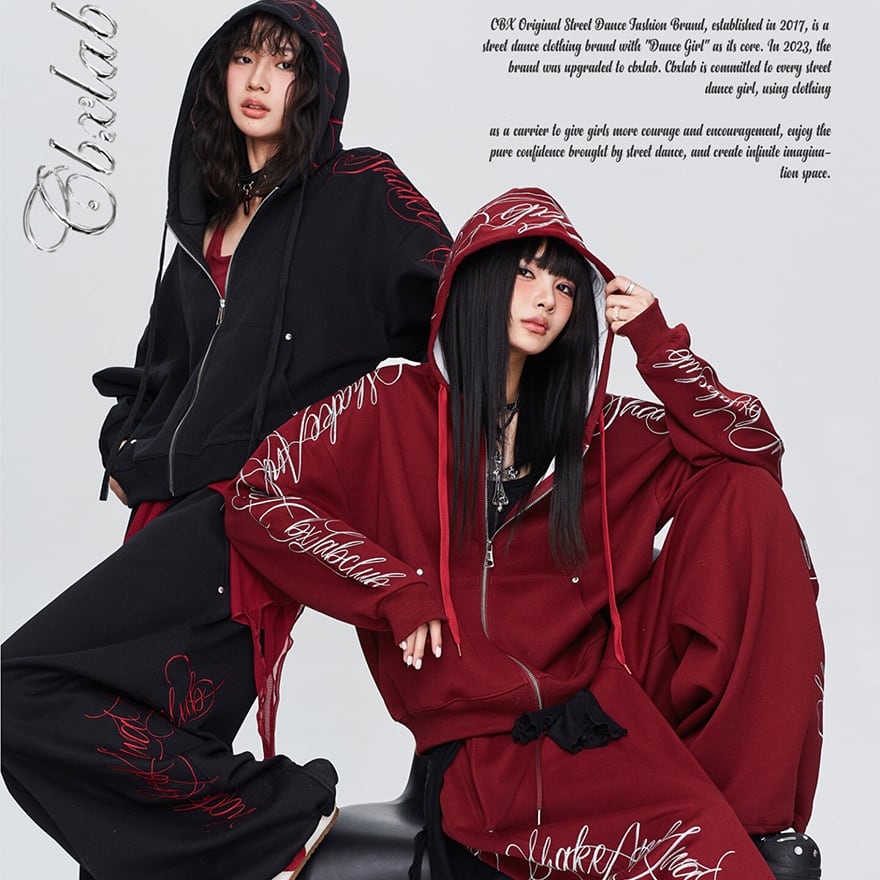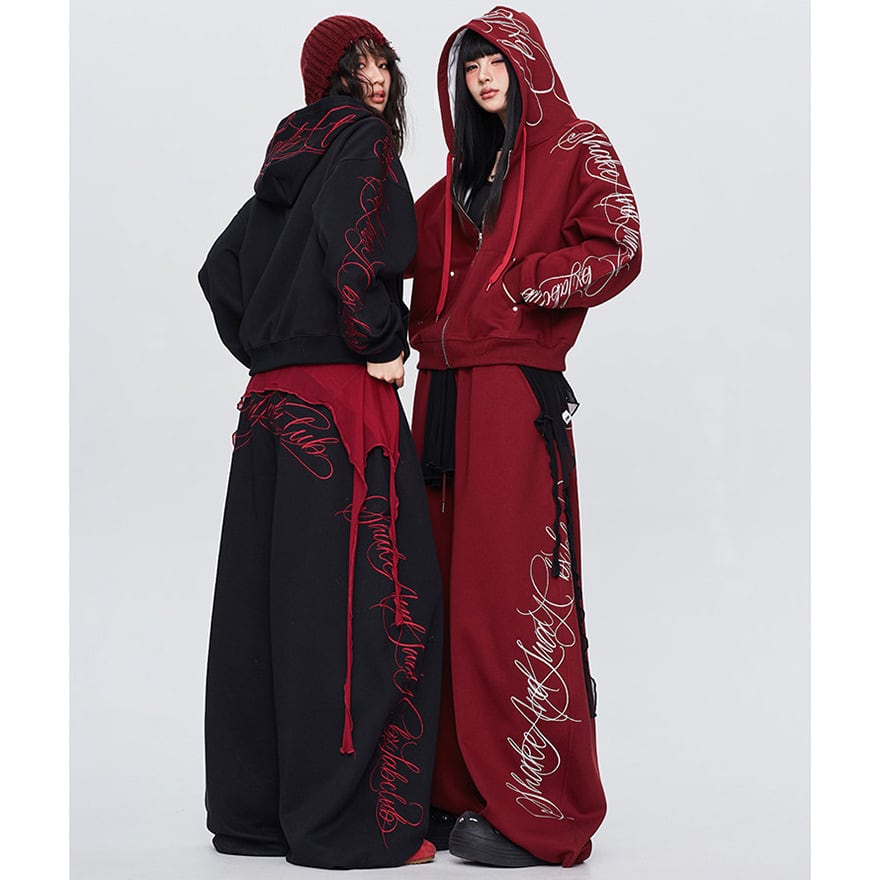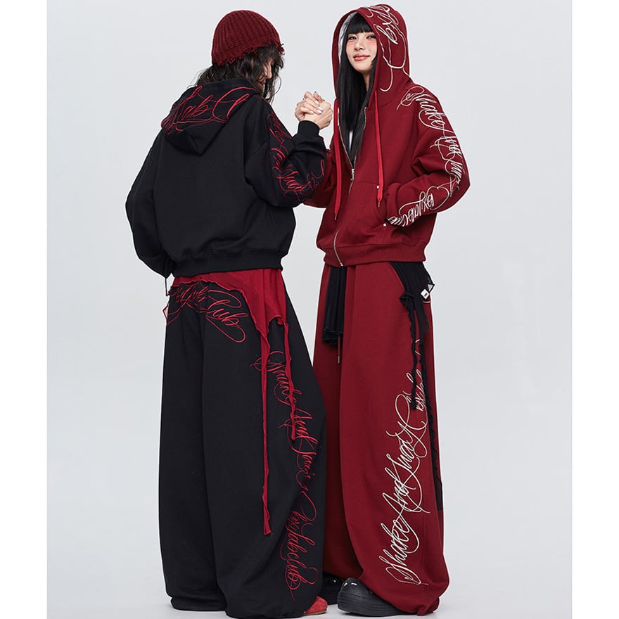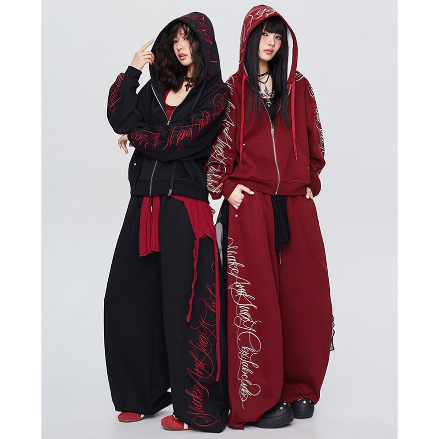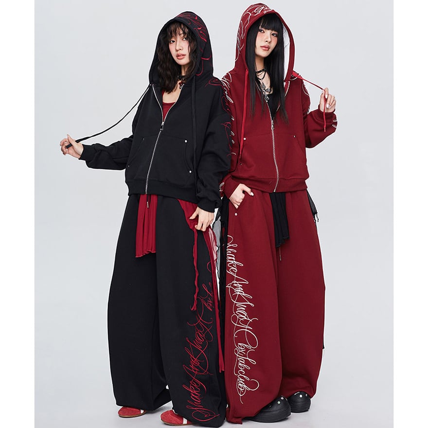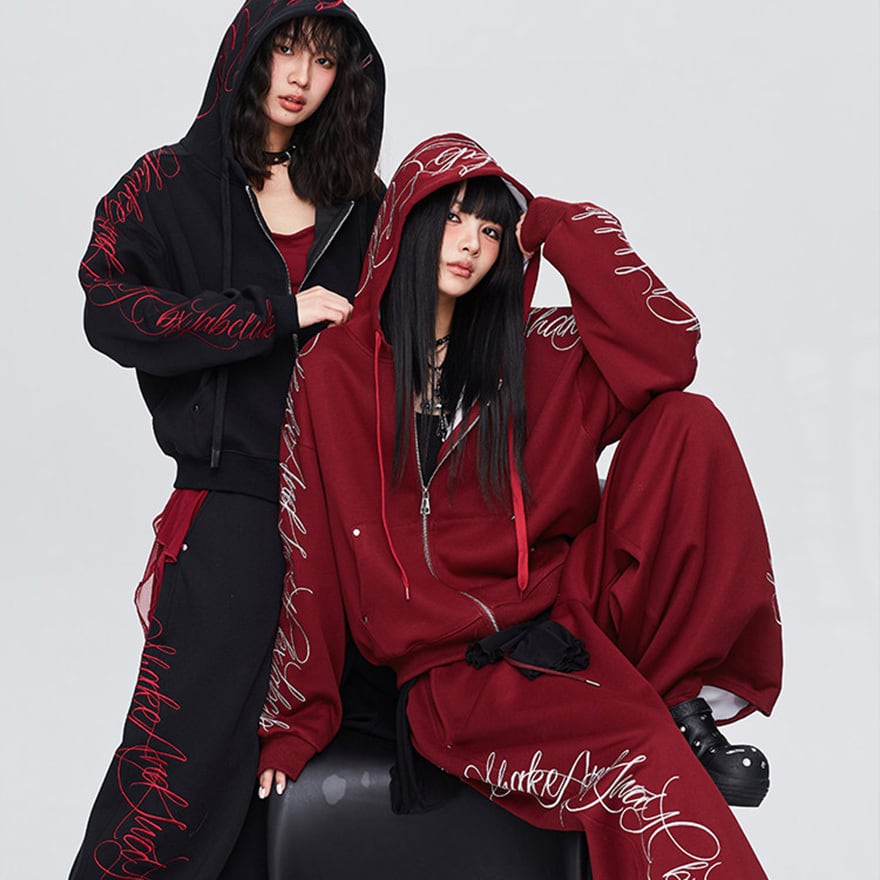 フードや袖に施された亮糸(光沢糸)による流麗な刺繍デザインが特徴で、Y2Kやストリートファッションに適しています。