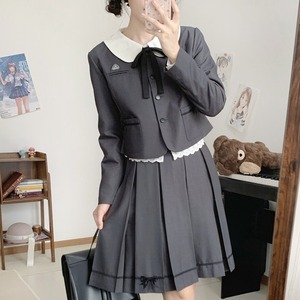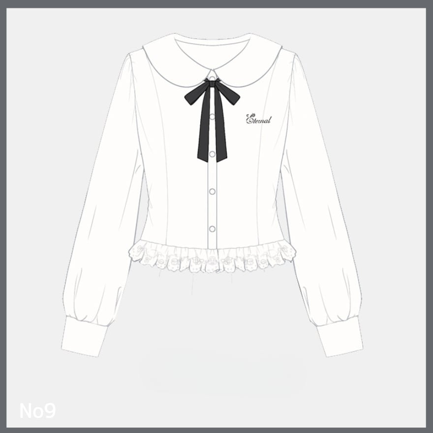ブラウス(トップス): フリル付きのスクエアネック。フロント中央には縦に並んだ4つのリボンが視線を惹きつけます。肩口がふんわりとしたパフ状の長袖で、中央に透け感のあるレース切り替えを施すことで、長袖特有の重さを感じさせないガーリーな仕上がりです。