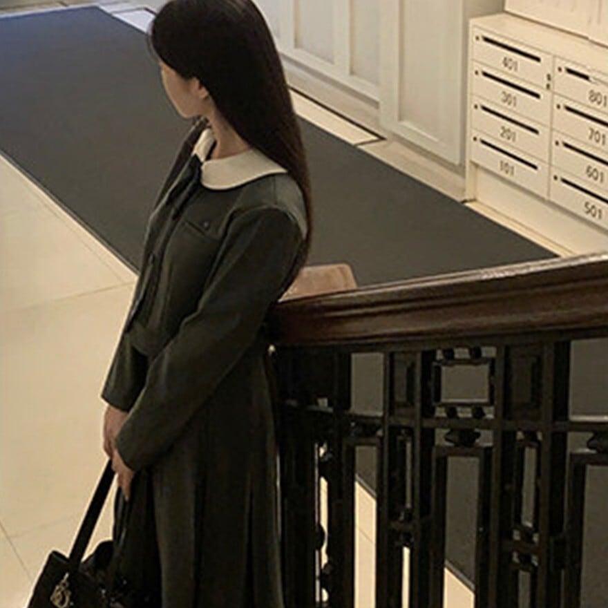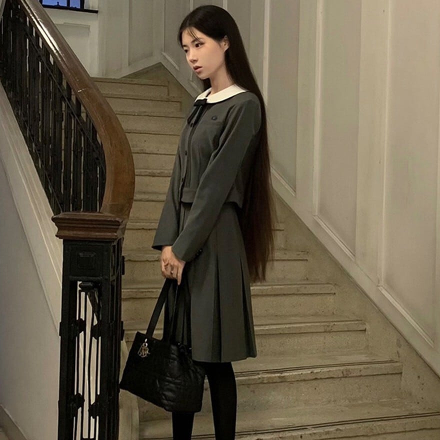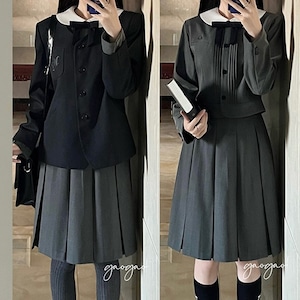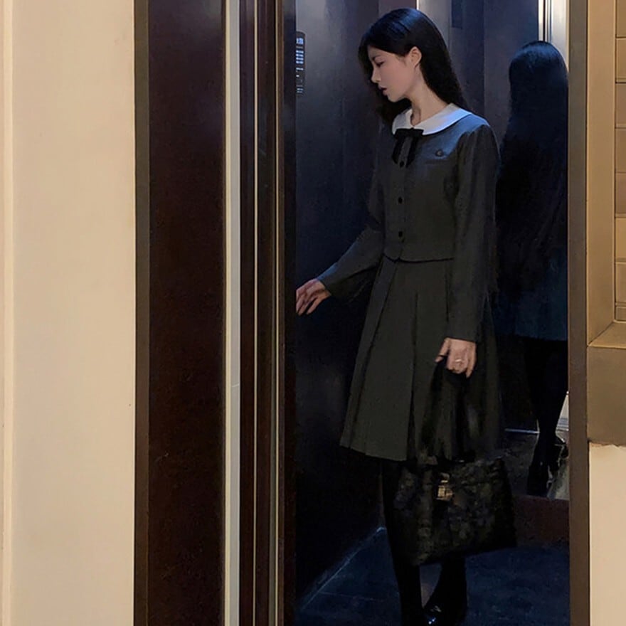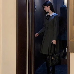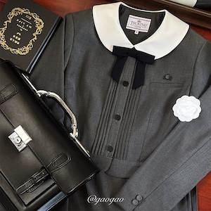丸襟とリボンが印象的なクラシカルデザインのロリィタ上下セットです。長袖ジャケットと58cm丈プリーツスカートで構成され、落ち着いた色味と合身シルエットが特徴。甘さを抑えた端正な佇まいのため、卒業式や入学式など改まった場にも対応します。ロリィタ要素を残しつつ実用性も意識した一着です。