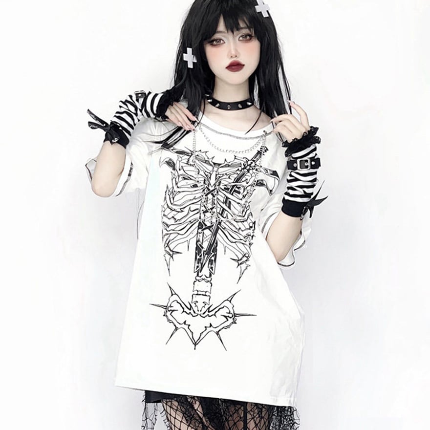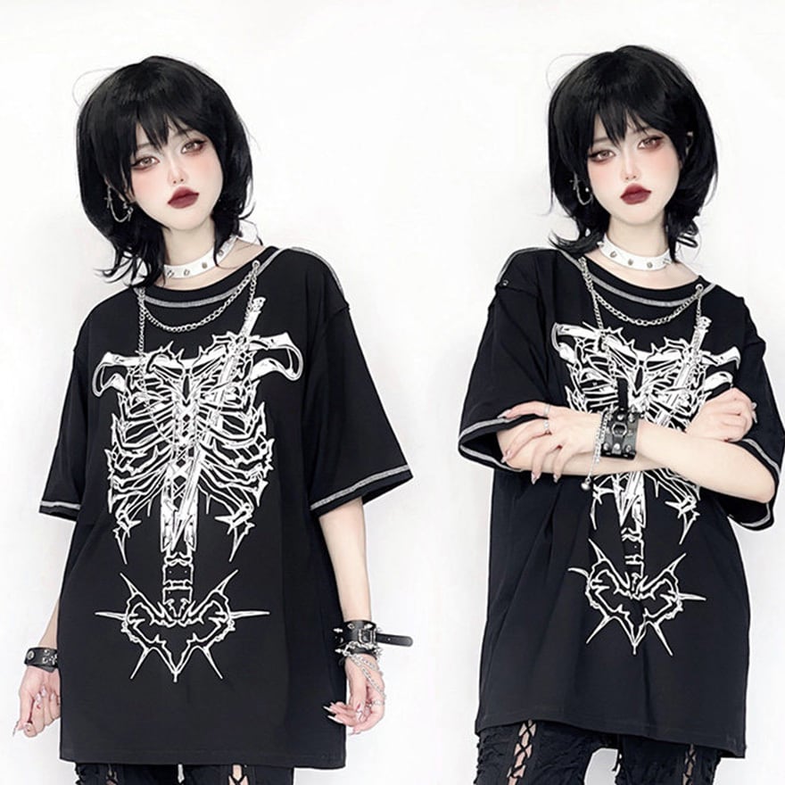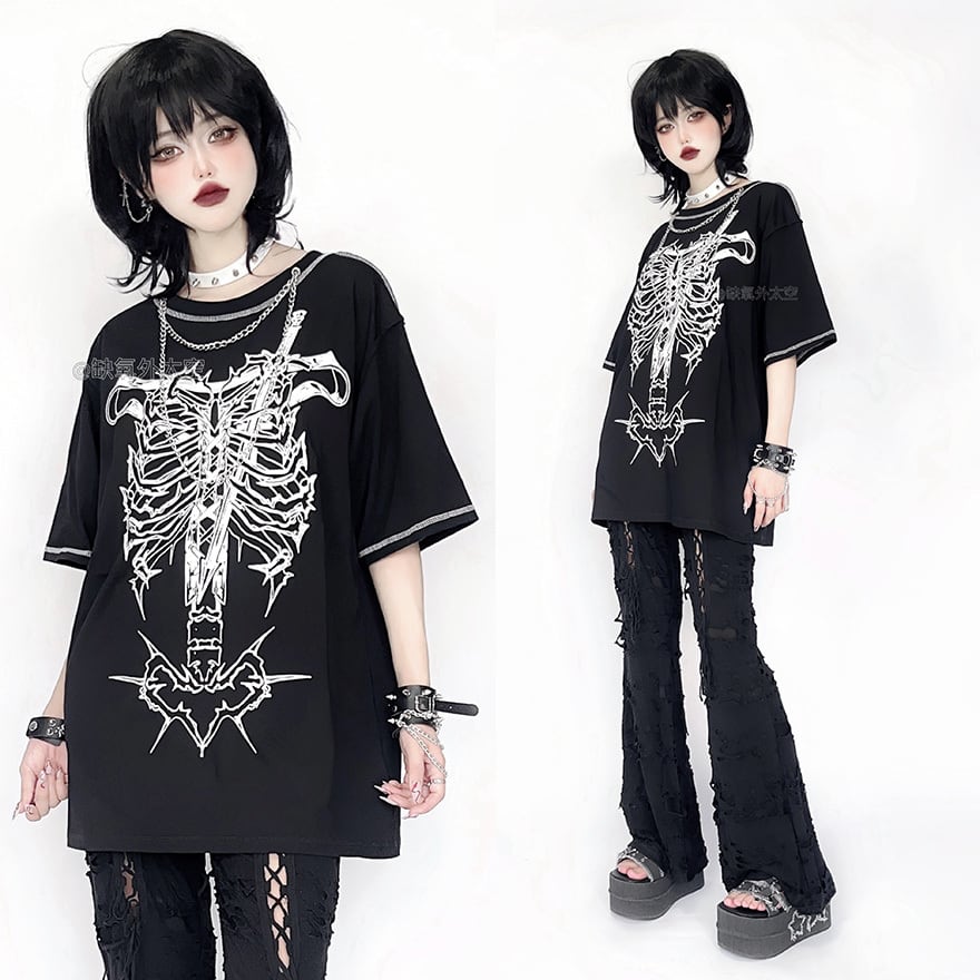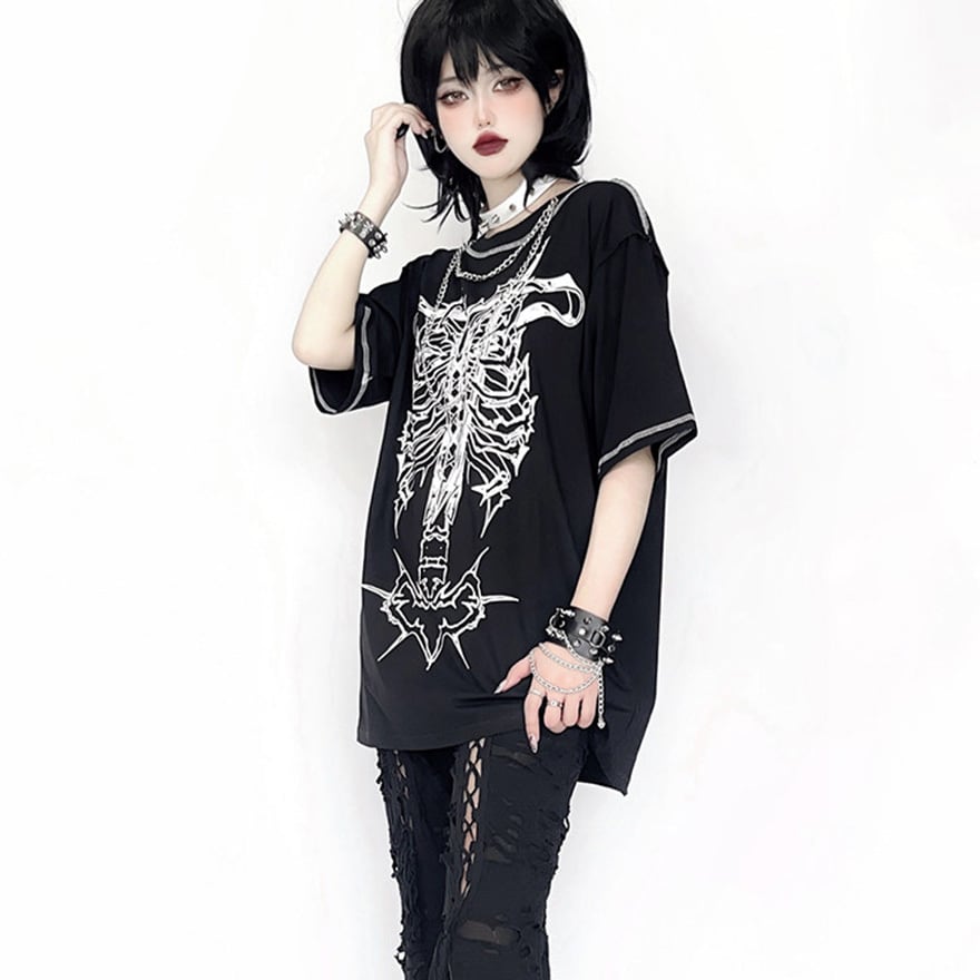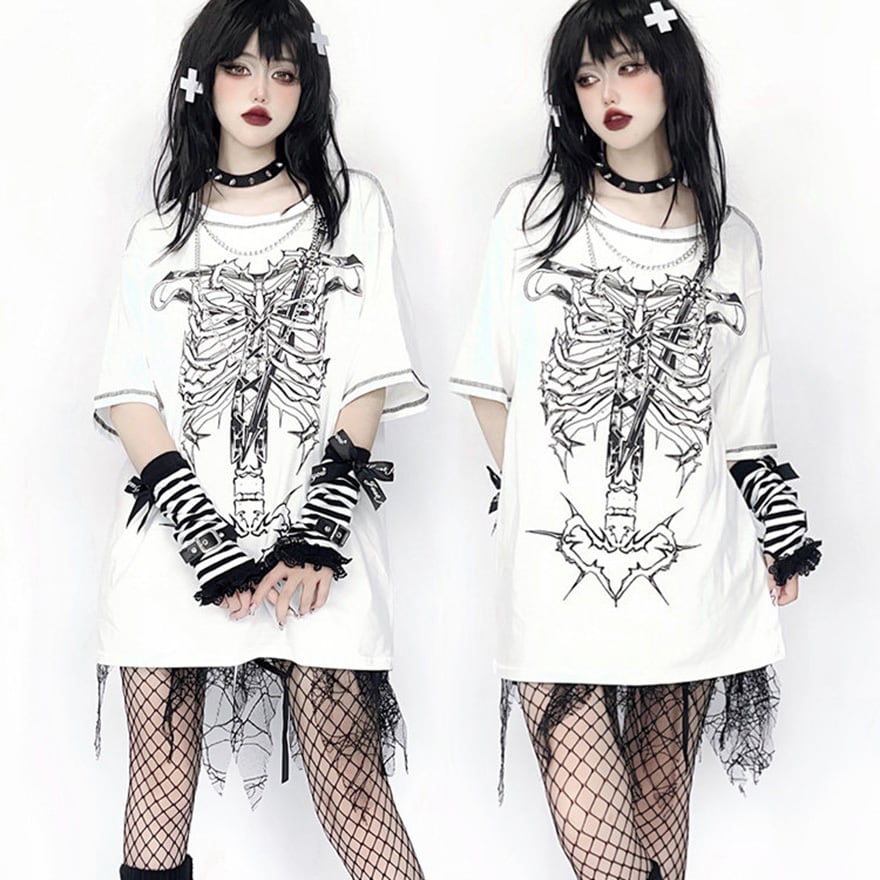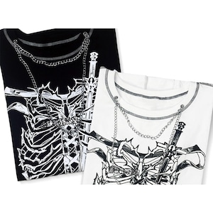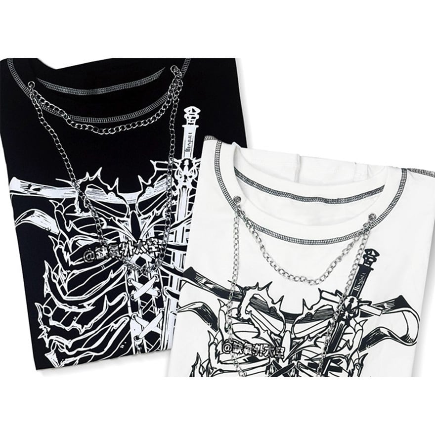 前面に大胆なスケルトン(肋骨)柄のプリントが施され、首元から肩にかけて取り外し可能な銀色の装飾チェーンが付属しています。