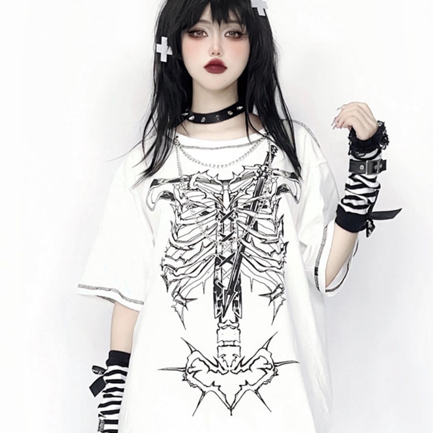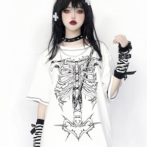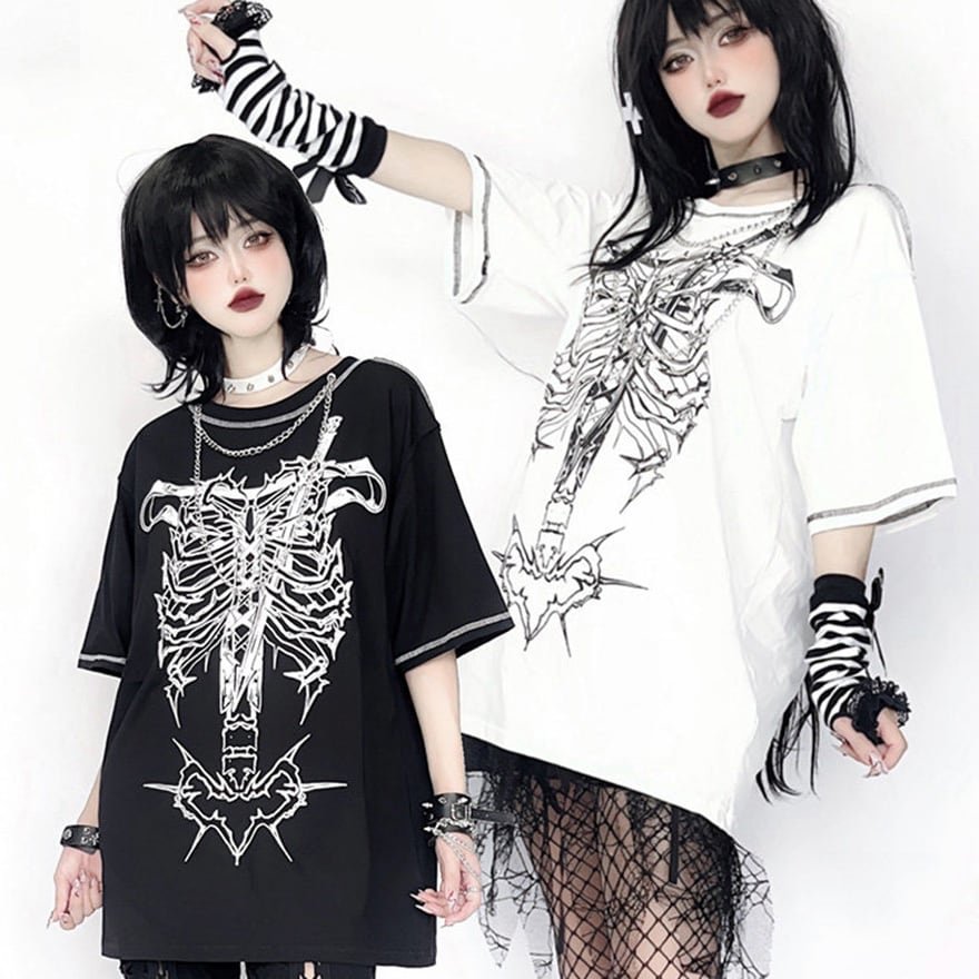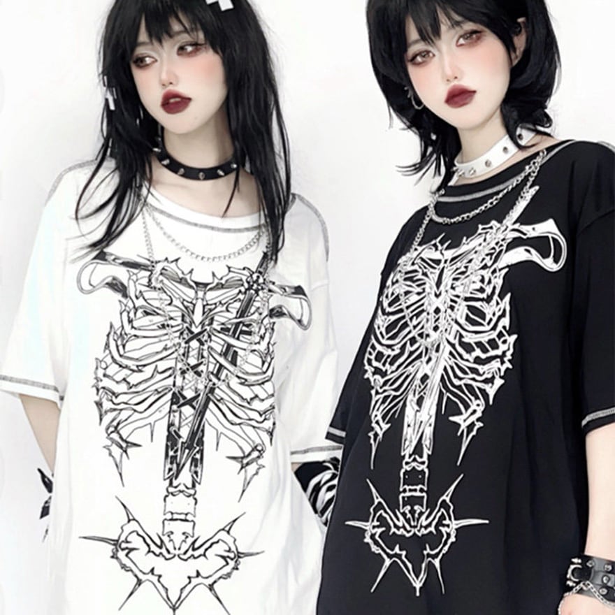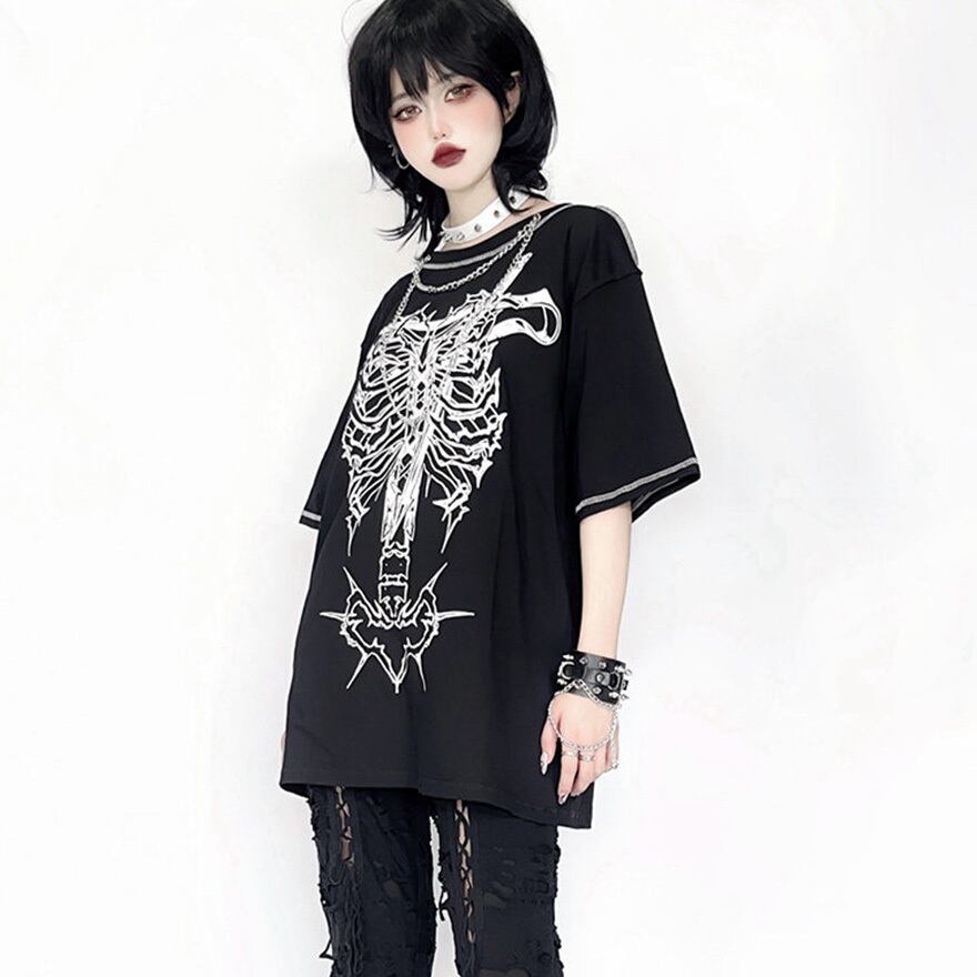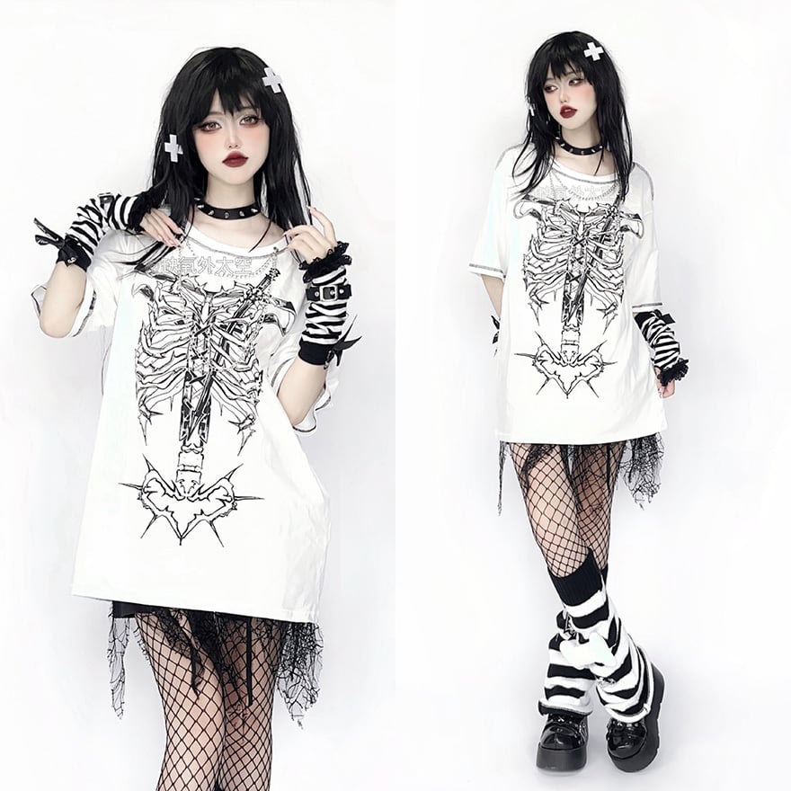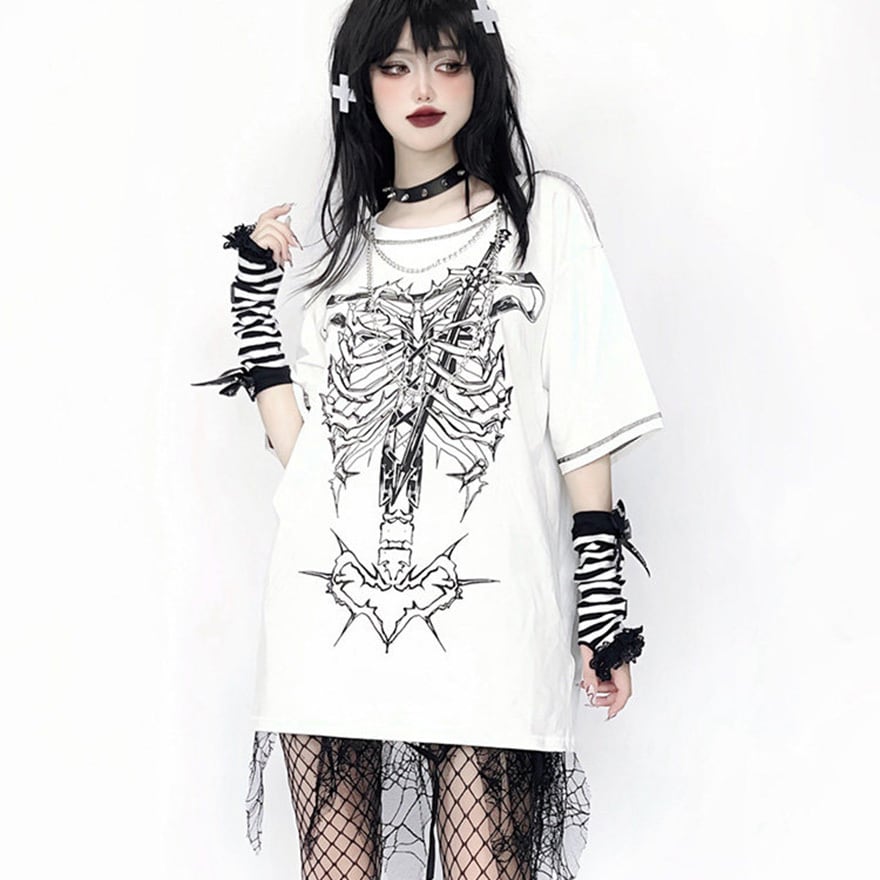 前面に大胆なスケルトン(肋骨)柄のプリントが施され、首元から肩にかけて取り外し可能な銀色の装飾チェーンが付属しています。
