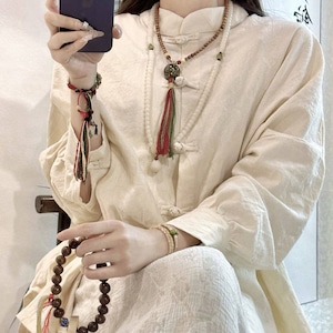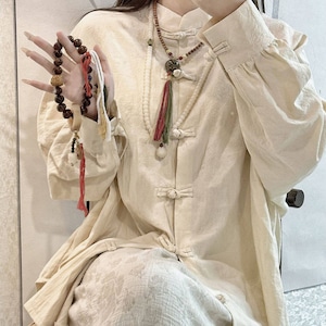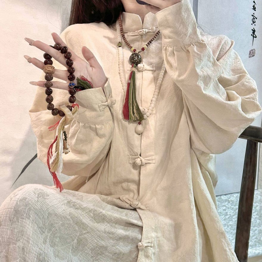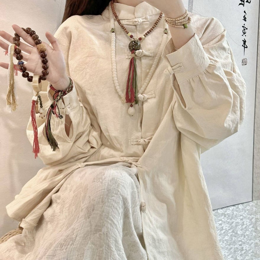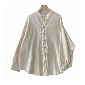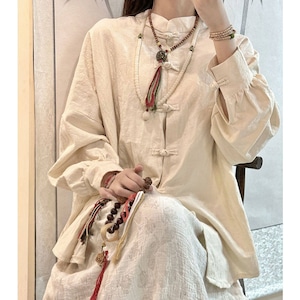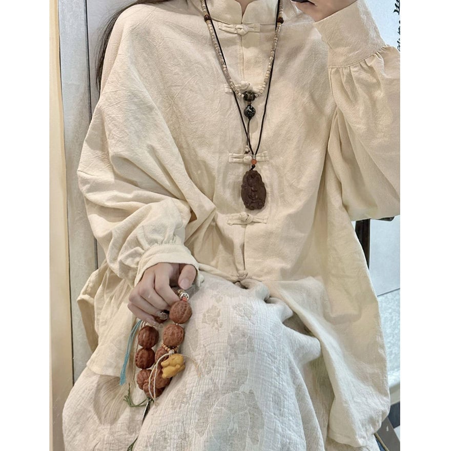 フロントに並ぶ伝統的な結びボタンと立ち襟が特徴で、ゆったりとしたオーバーサイズなシルエットに仕上げられています。