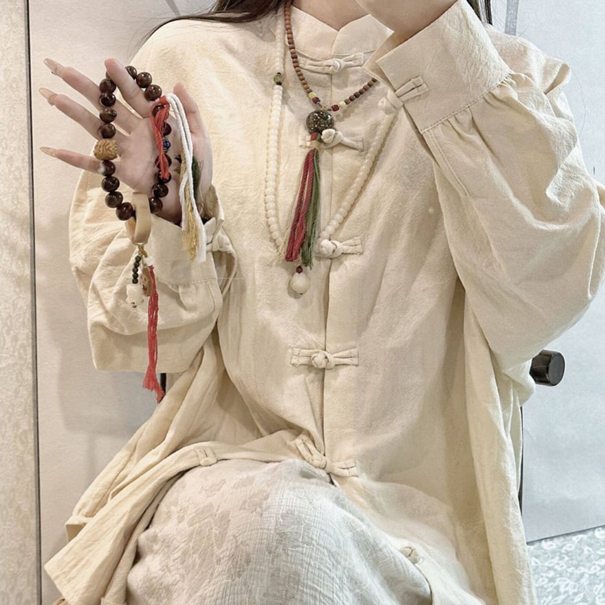 フロントには7つの結びボタンが配置され、首元はすっきりとした立ち襟(スタンドカラー)仕様です。
