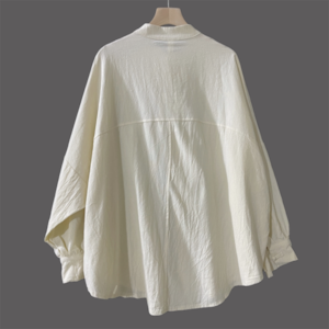 肩の位置を落としたドロップショルダーと、袖口にギャザーを寄せたボリューム袖が特徴です。裾は緩やかなラウンドカットになっています。