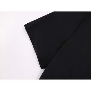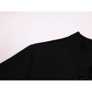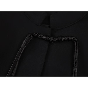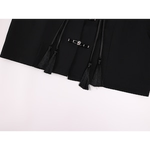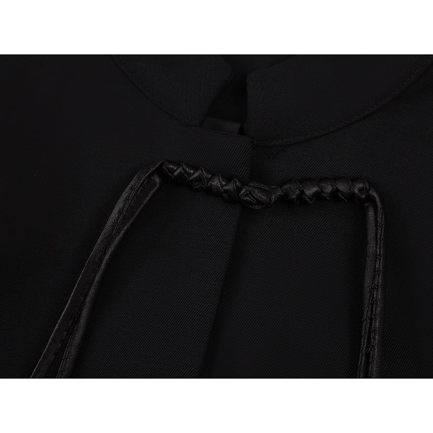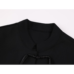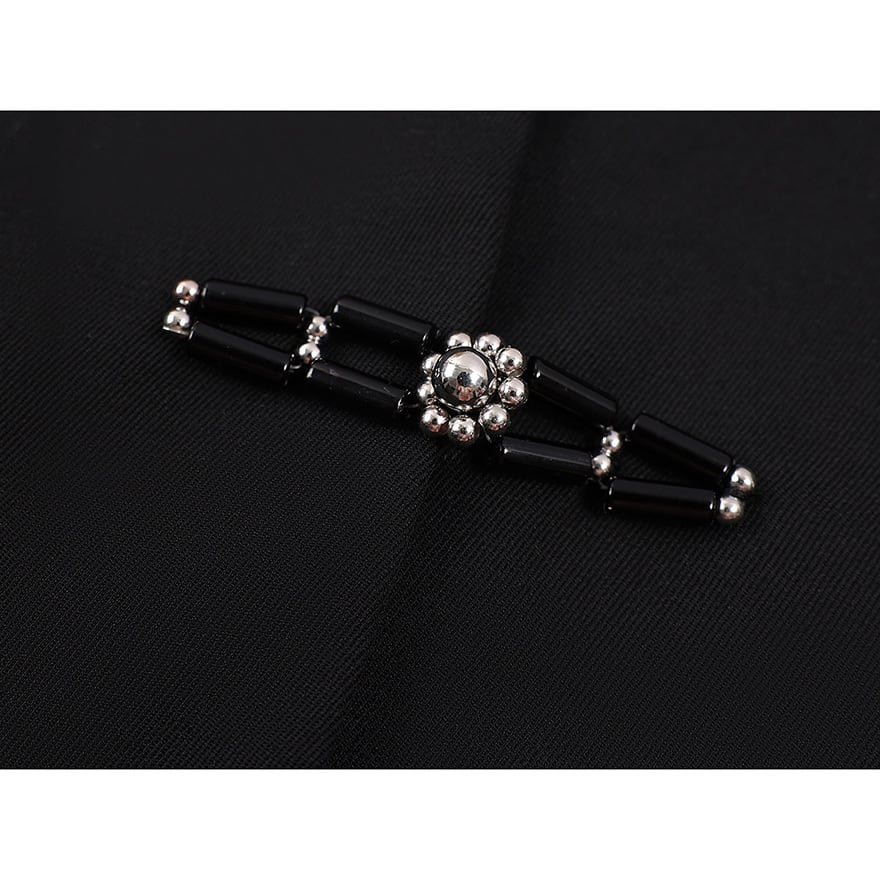 色は黒で、首元は中華風の立ち襟仕様です。フロント中央には、黒い筒状のビーズと銀色の球状ビーズを組み合わせた華やかな留め具が2つ配置されています。
