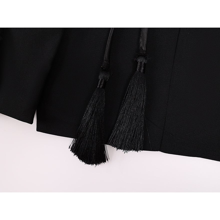 立ち襟のデザインに、フロントのビーズ装飾と長く垂れ下がるタッセルが特徴的な一着です。
