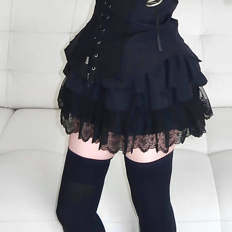地雷系ジャンルの三段フリルミニスカートです。ボリュームのあるティアード構造に、裾の繊細なレースが特徴のデザインです。