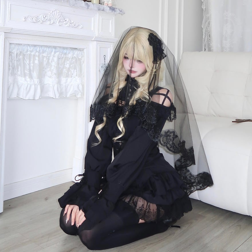 黒色の無地生地を使用した三段のフリル構造です。各フリルの裾には透け感のある黒いレースがあしらわれています。