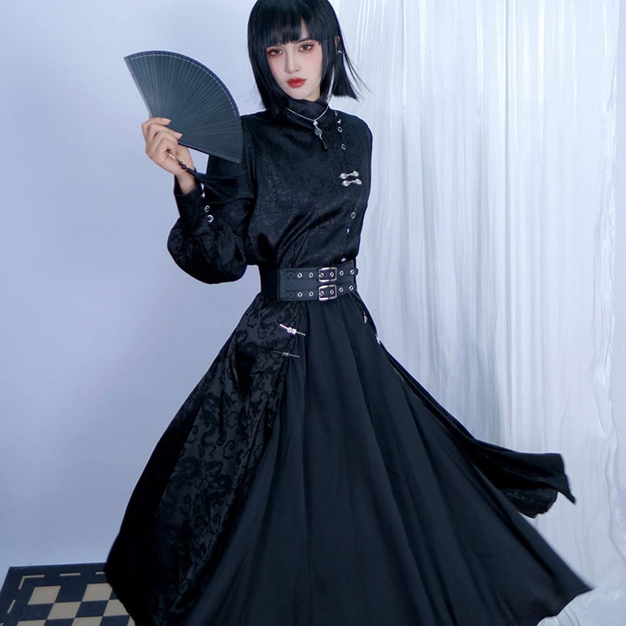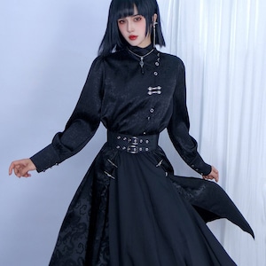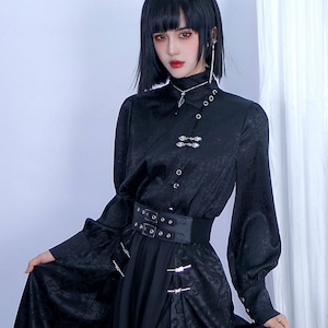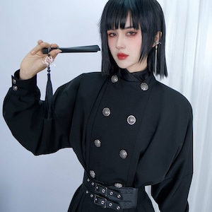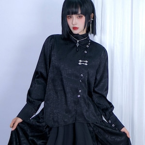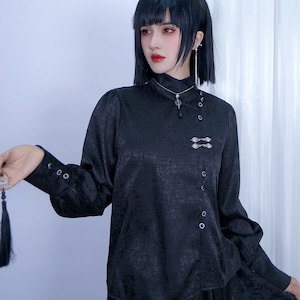 中華ゴシックジャンルの長袖シャツです。首元を覆う立ち襟と、斜めに配置された前面の釦、胸元の銀色の装飾釦が特徴です。