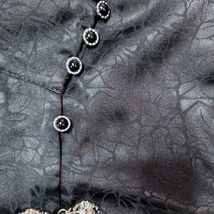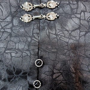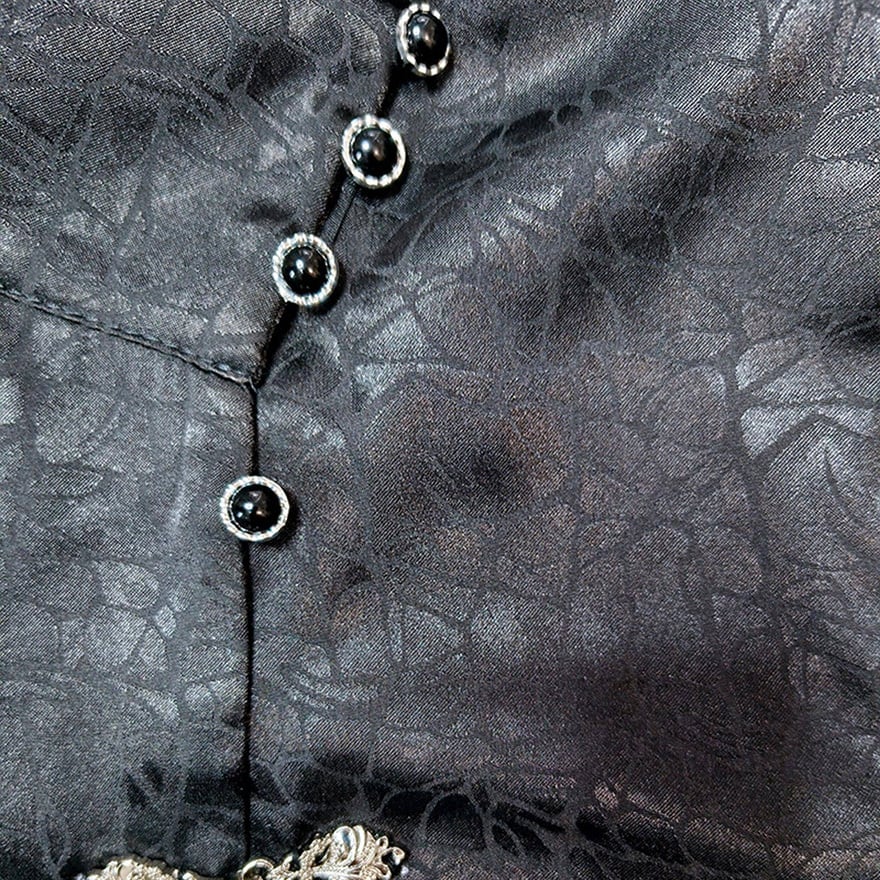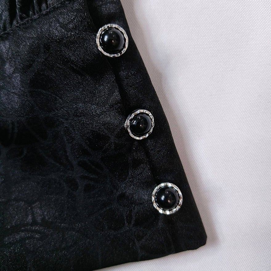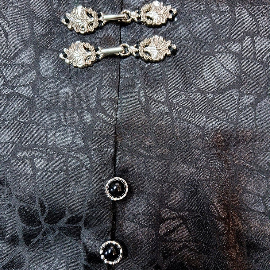 胸元には銀色の装飾的なチャイナ釦風パーツが2つ付いています。袖口には3つの小さな釦が配置されています。