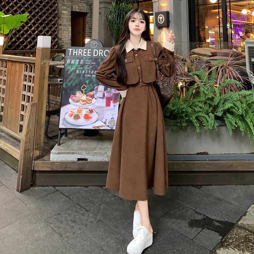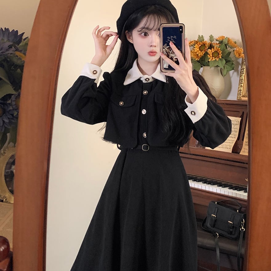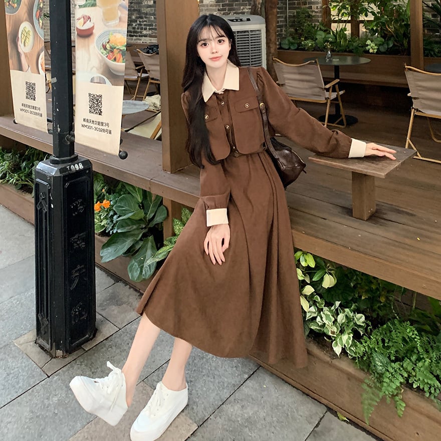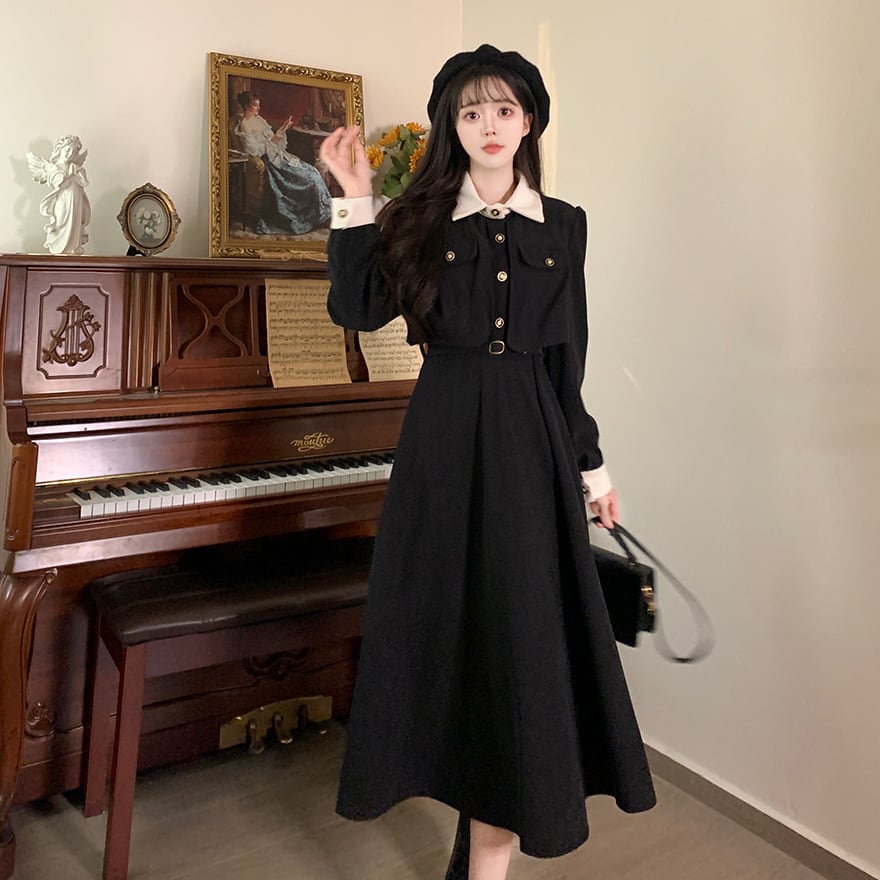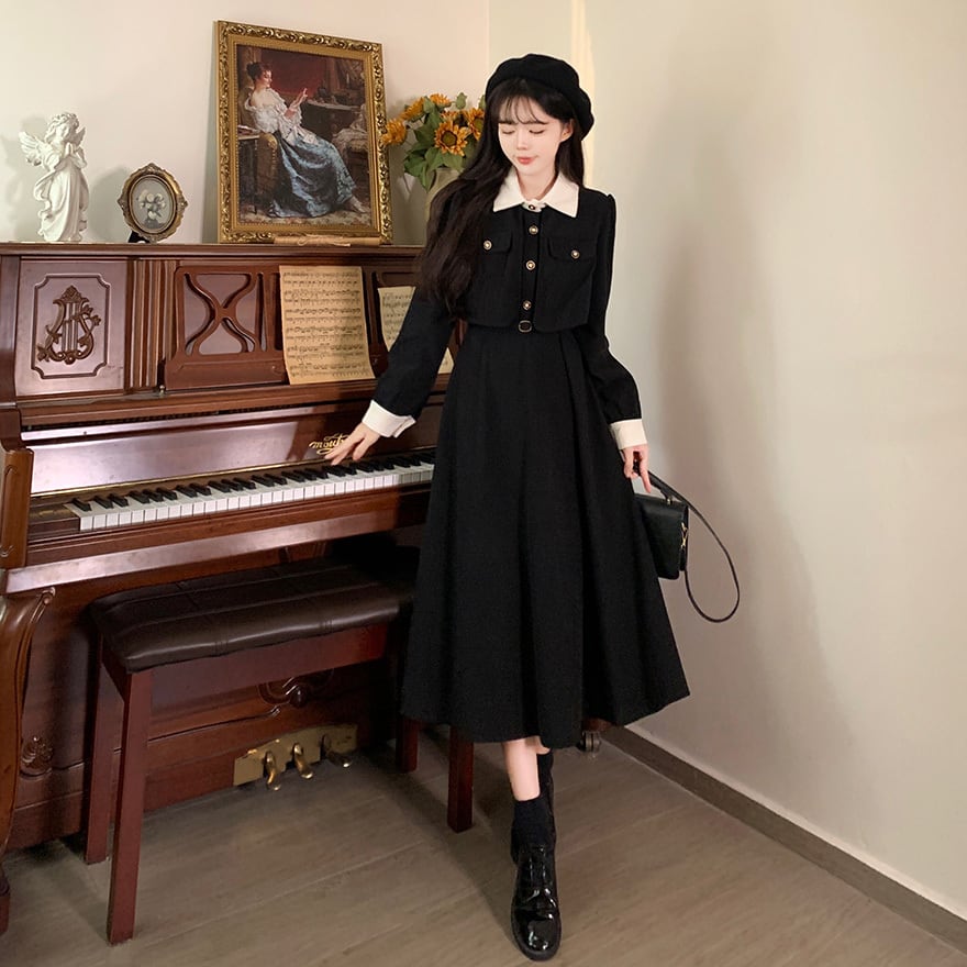 配色襟と袖口の切り替え、胸元の金色の釦装飾が特徴で、クラシカルかつレトロな印象を与えるシルエットになっています。