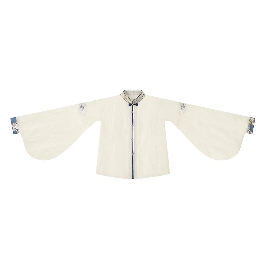 上衣はオフホワイトの生地に、襟元や袖口に青色の装飾が施されています。袖は非常に幅の広い広袖仕様です。