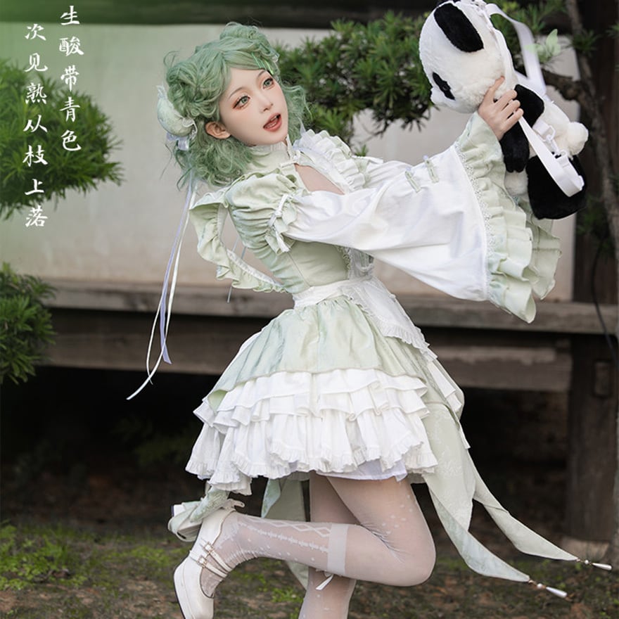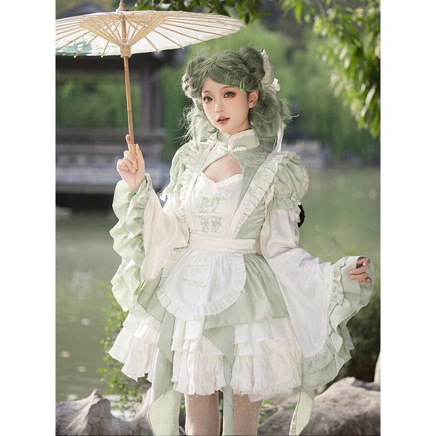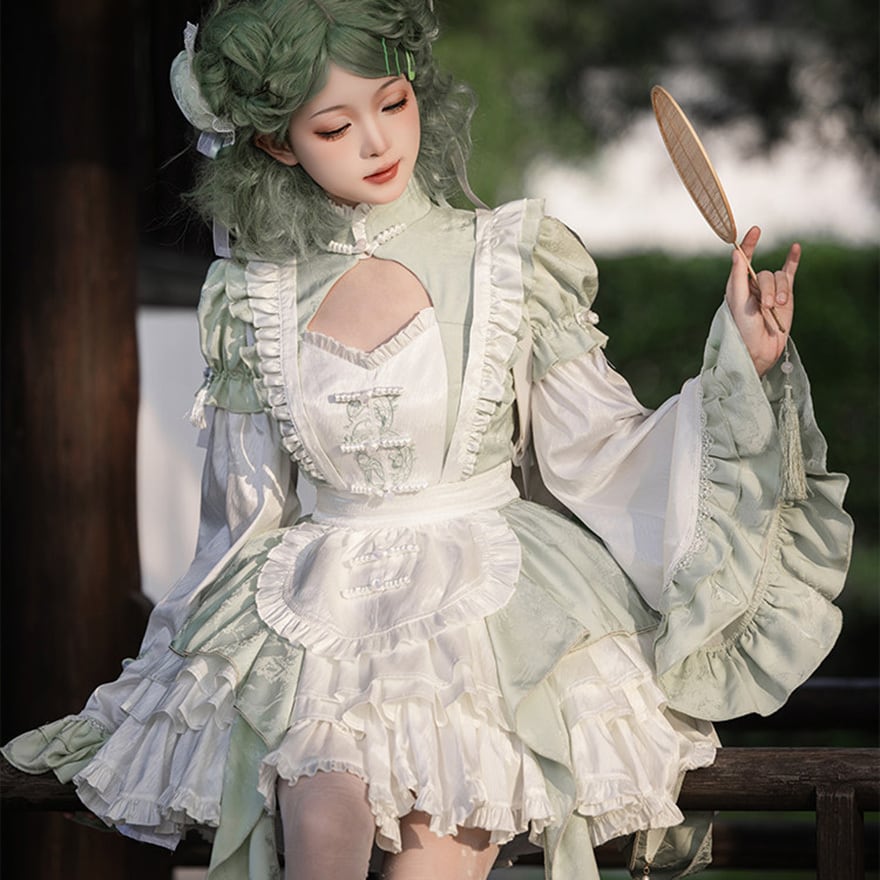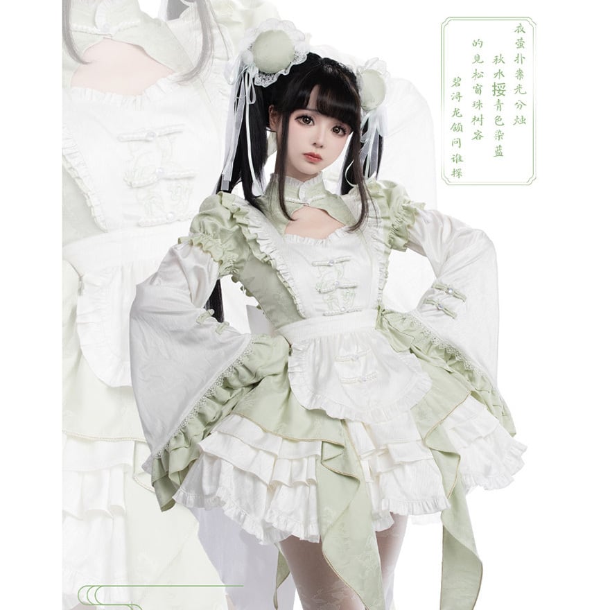 ミントグリーンと白の配色が特徴で、立襟や盤扣(チャイナボタン)などの中華要素と、フリルを多用したメイド服の要素が融合しています。
