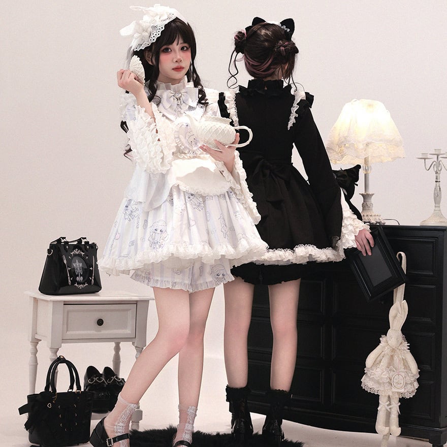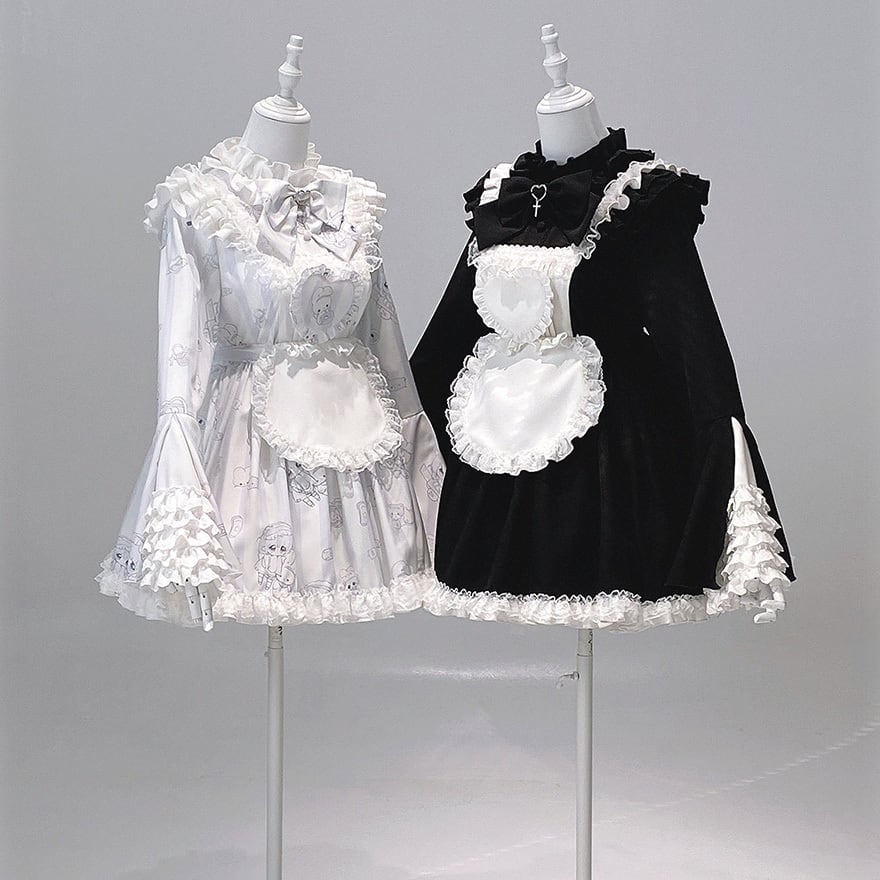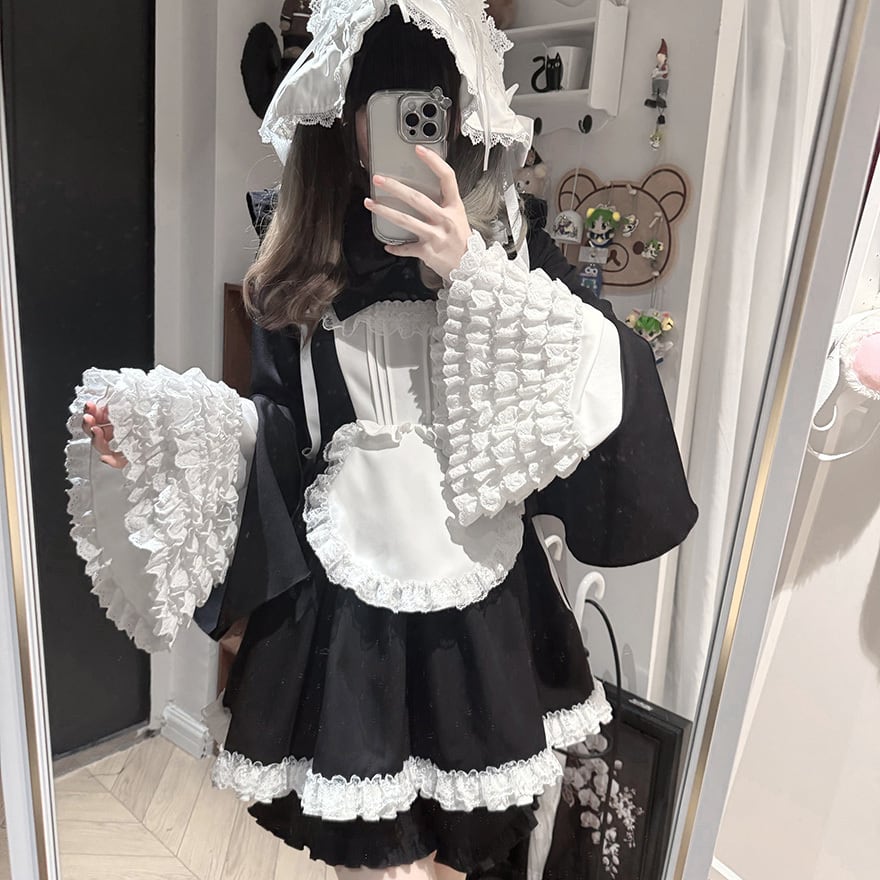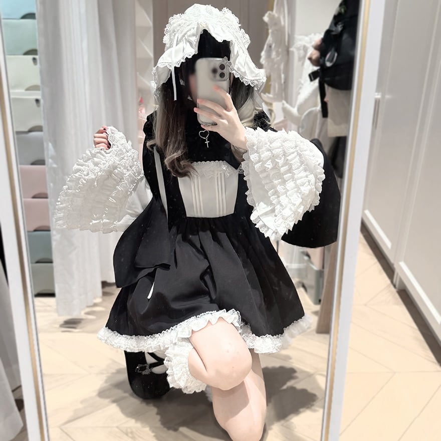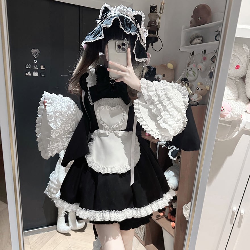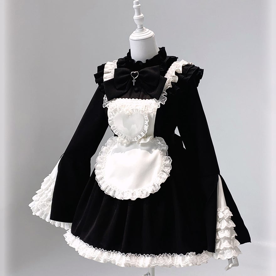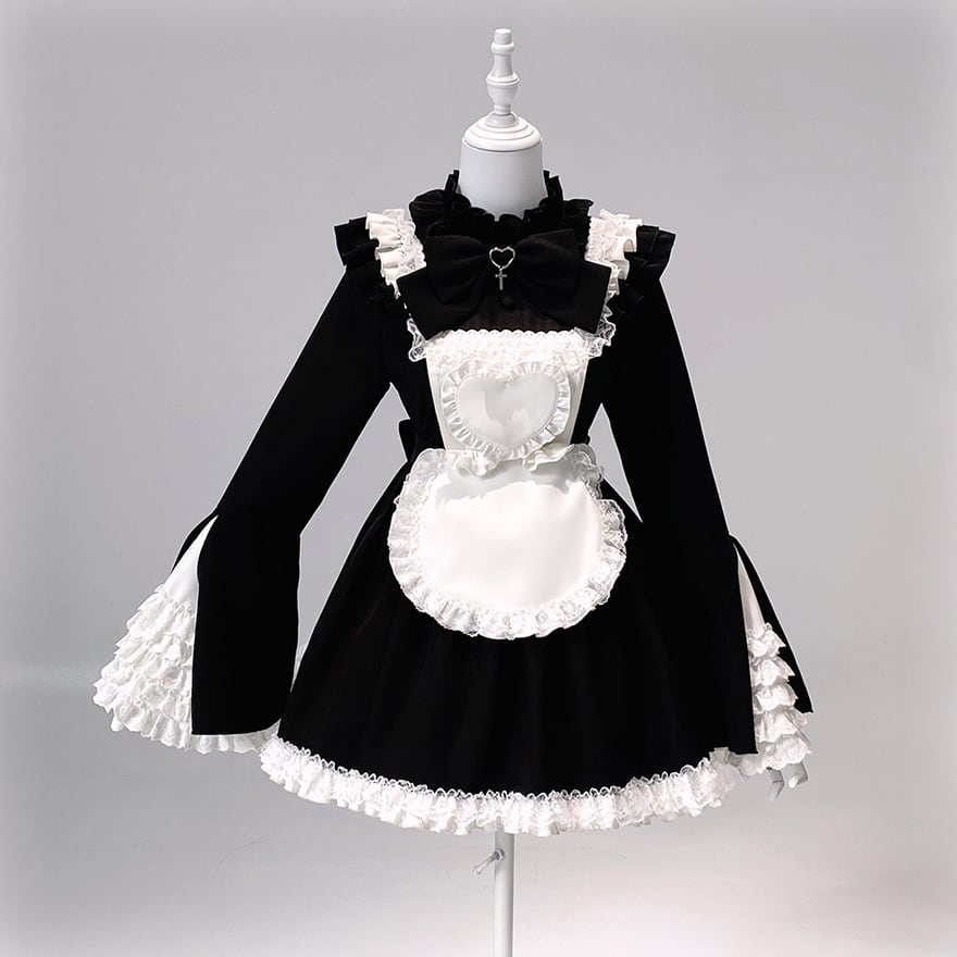 袖口の多段フリルや、胸元の大きなリボン、ハート型の装飾が特徴です。黒と白のコントラストが映えるデザインと、