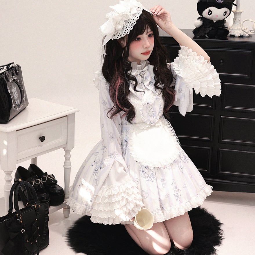 ブラウスは首元に大きなリボンがあり、袖口に向かって広がるベルスリーブ仕様で、段状のフリルが施されています。