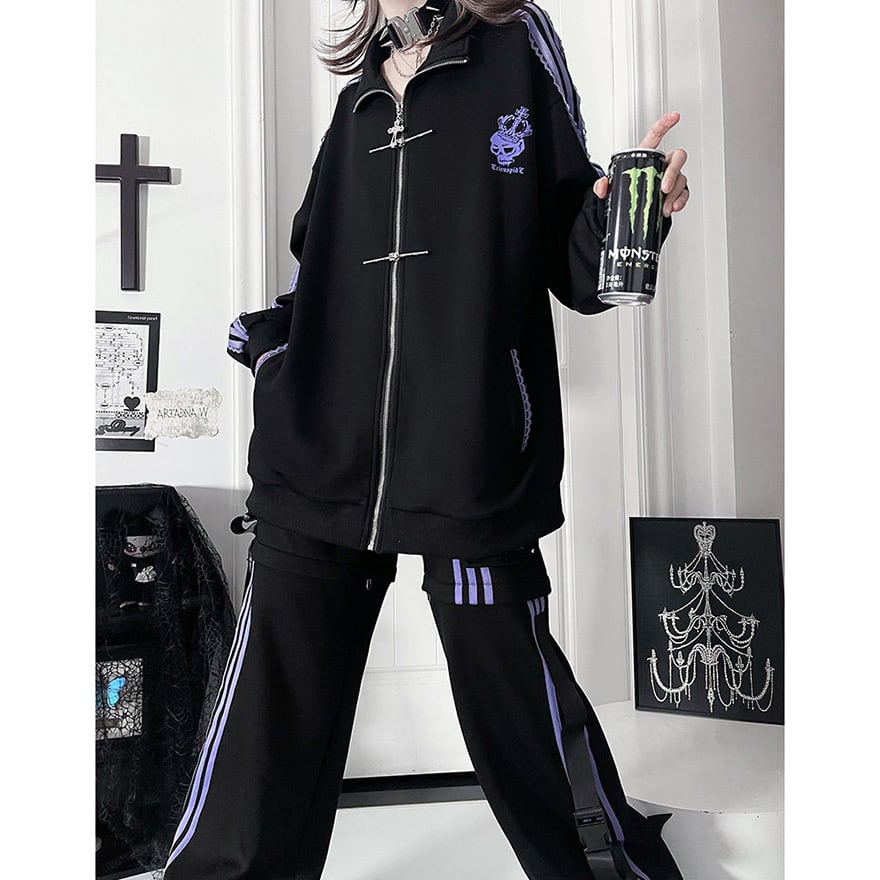 ・TikTok撮影やInstagram投稿に。黒×パープルの配色と縦ラインがしっかり映えるので、パンツコーデでも地雷系の世界観を濃く見せられます。
