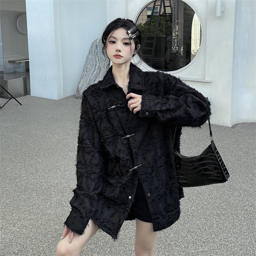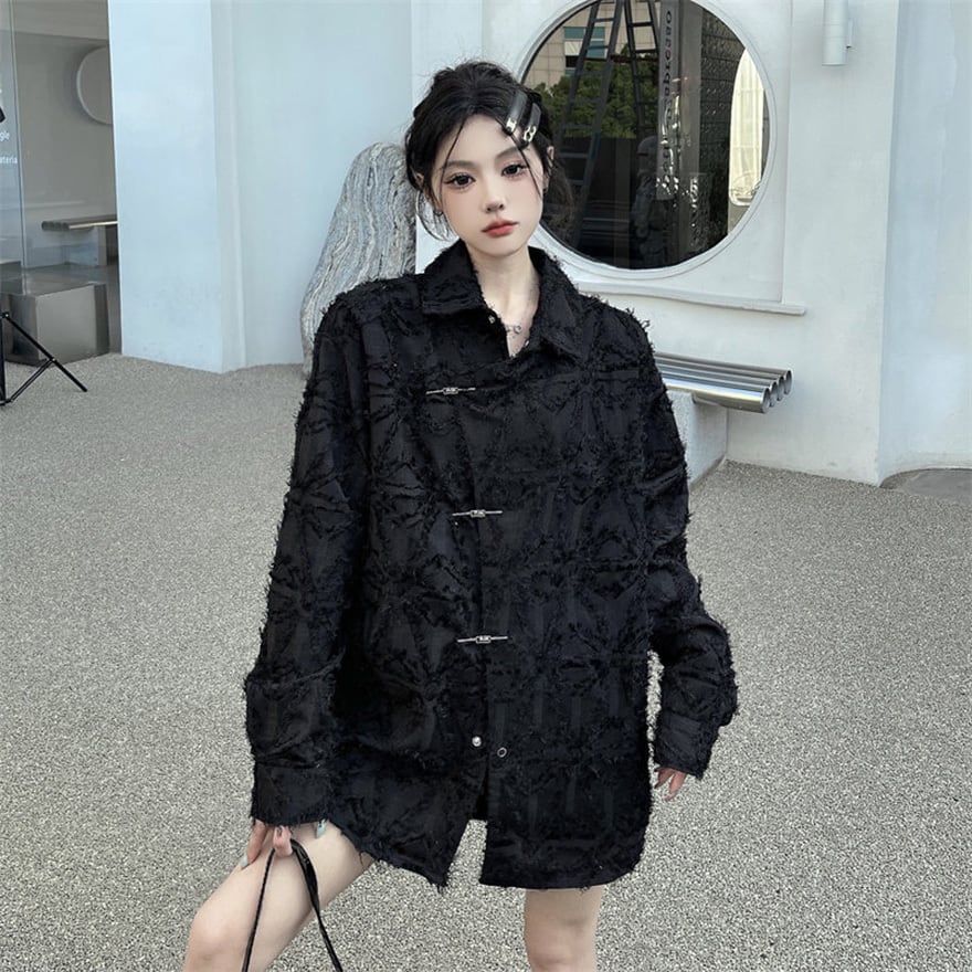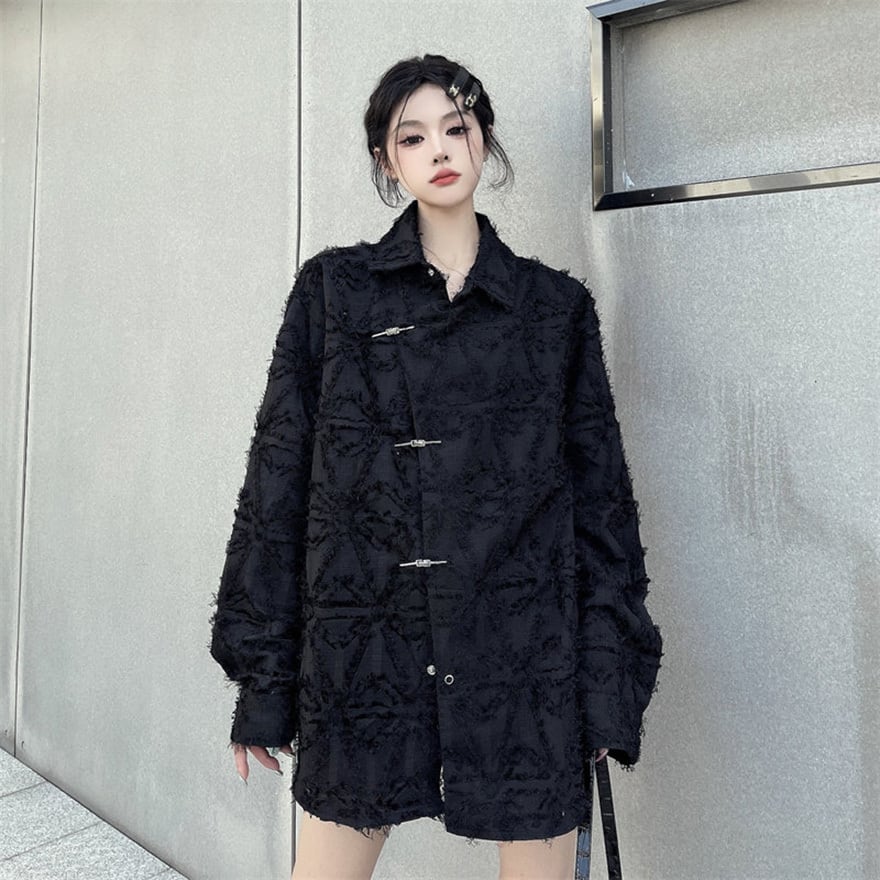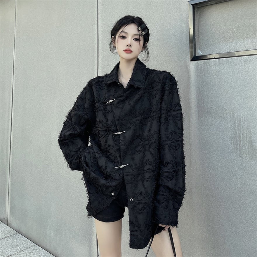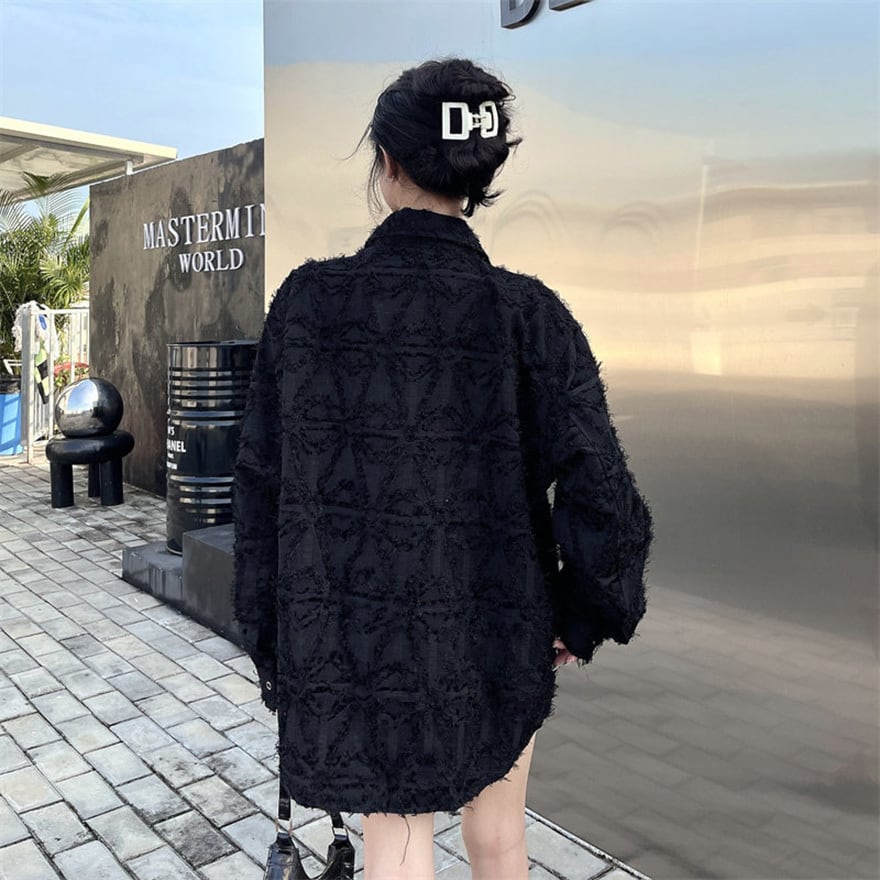 黒一色で魅せる立体感のあるテクスチャーと存在感のあるフロントデザインが特徴で、TikTok映えするダークコーデや撮影会、推し活のおでかけにぴったりです。シンプルな黒なのに埋もれず、纏うだけで静かな圧を作れる一着です。