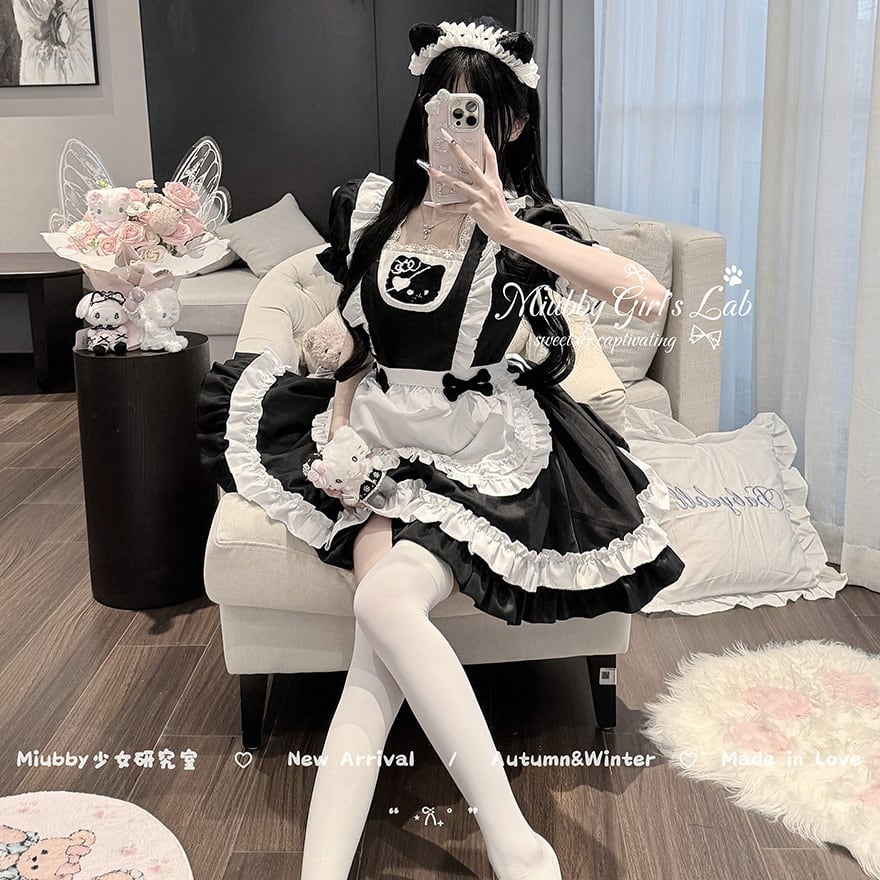 黒×白の王道配色にフリルエプロンと胸元の猫モチーフを重ねたデザインが特徴で、TikTok映えする撮影コーデや推し活、おでかけにぴったりです。甘さをしっかり出しながらも黒の分量で全体が締まるので、可愛いだけで終わらない印象的なメイドコーデにまとまります。