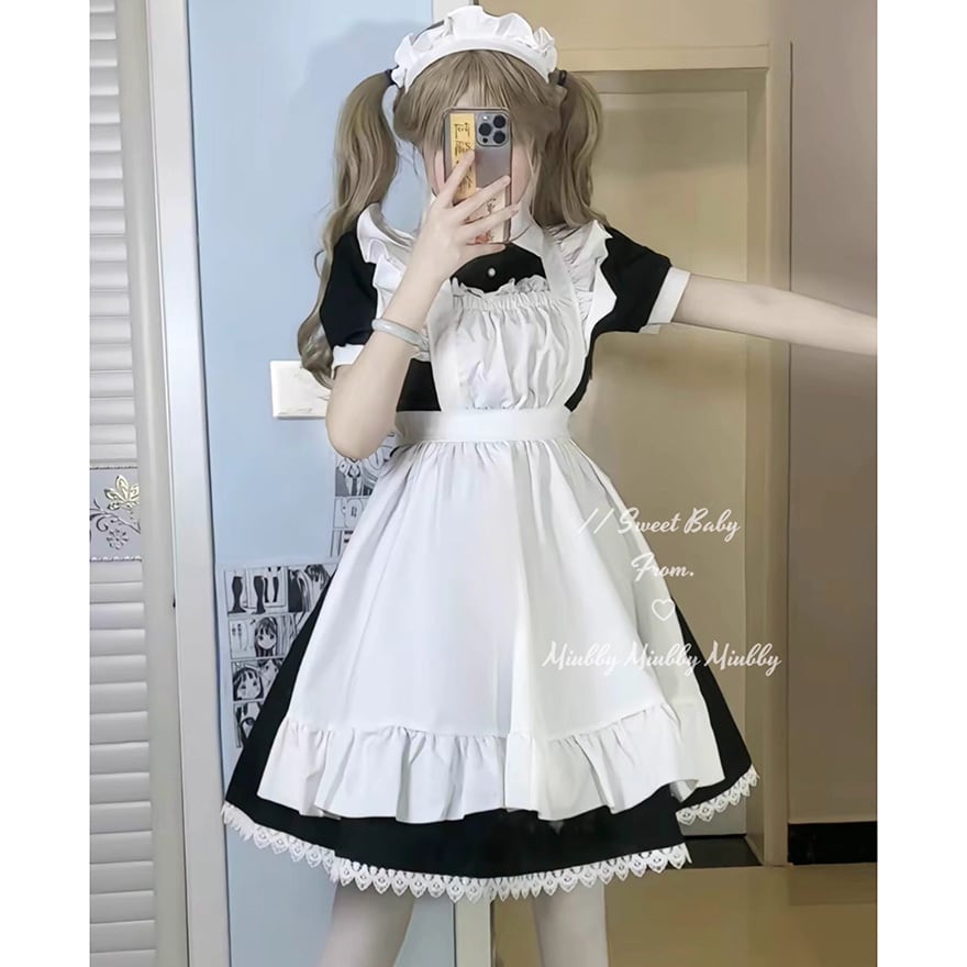 白エプロンを重ねたクラシカルなメイド風デザインが特徴で、撮影会や推し活イベント、コンセプトコーデに最適です。裾に向かって広がるロング寄りのシルエットが動くたびにやわらかく揺れて、立ち姿だけで世界観を濃く見せてくれます。
