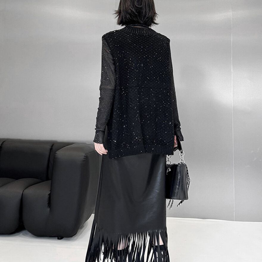 黒地のケーブル編みにスパンコールが散りばめられ、裾が斜めにカットされたアシンメトリーなデザインが特徴です。
