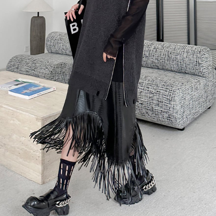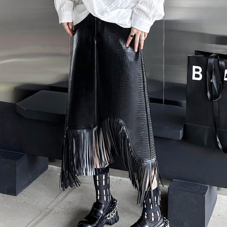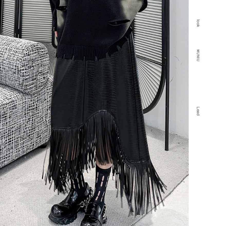サブカル系の人工皮革製スカートです。表面にはクロコダイル調の型押し加工が施され、裾部分には約19センチメートルの長いフリンジが装飾されています。