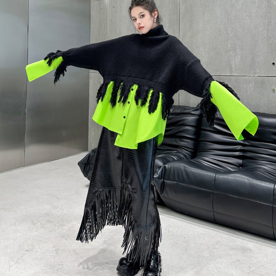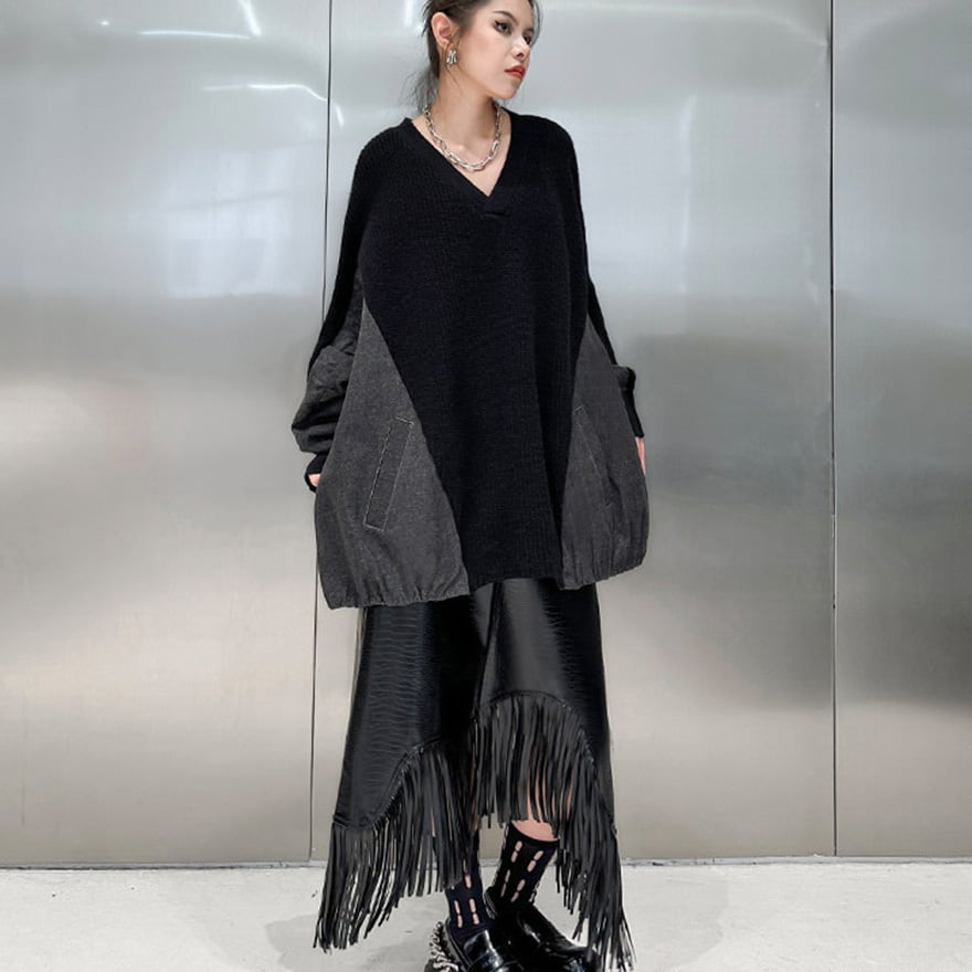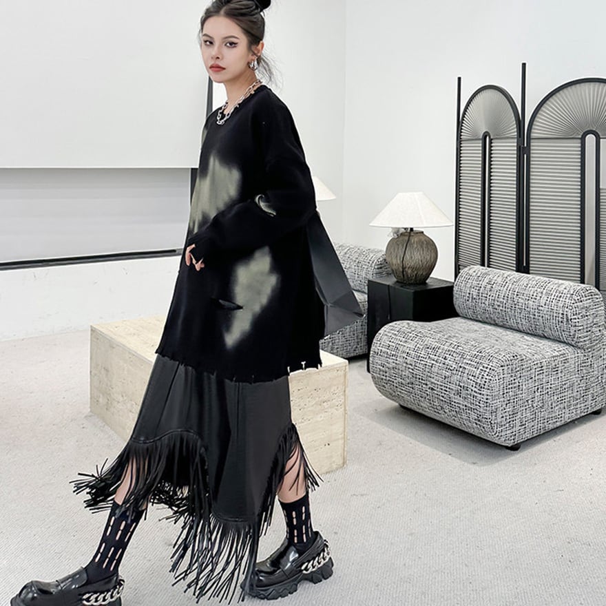 裾は前後で長さが異なるアシンメトリーな形状で、裾全体に長いフリンジが配置されています。