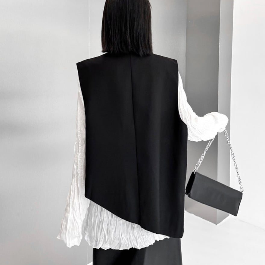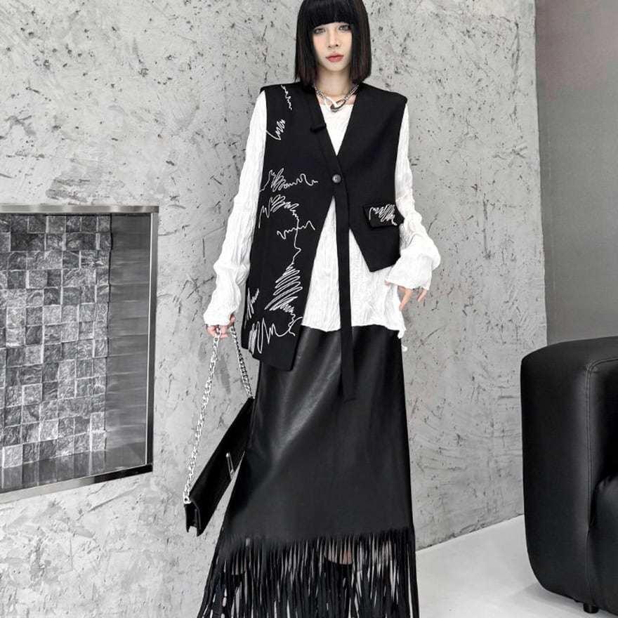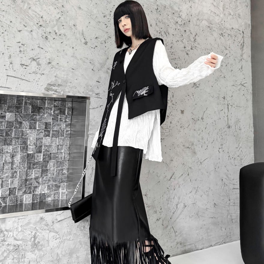 黒を基調とした生地に、白の線画のような装飾が施されています。左右で丈の長さが異なるイレギュラーな裾のデザインが特徴です。