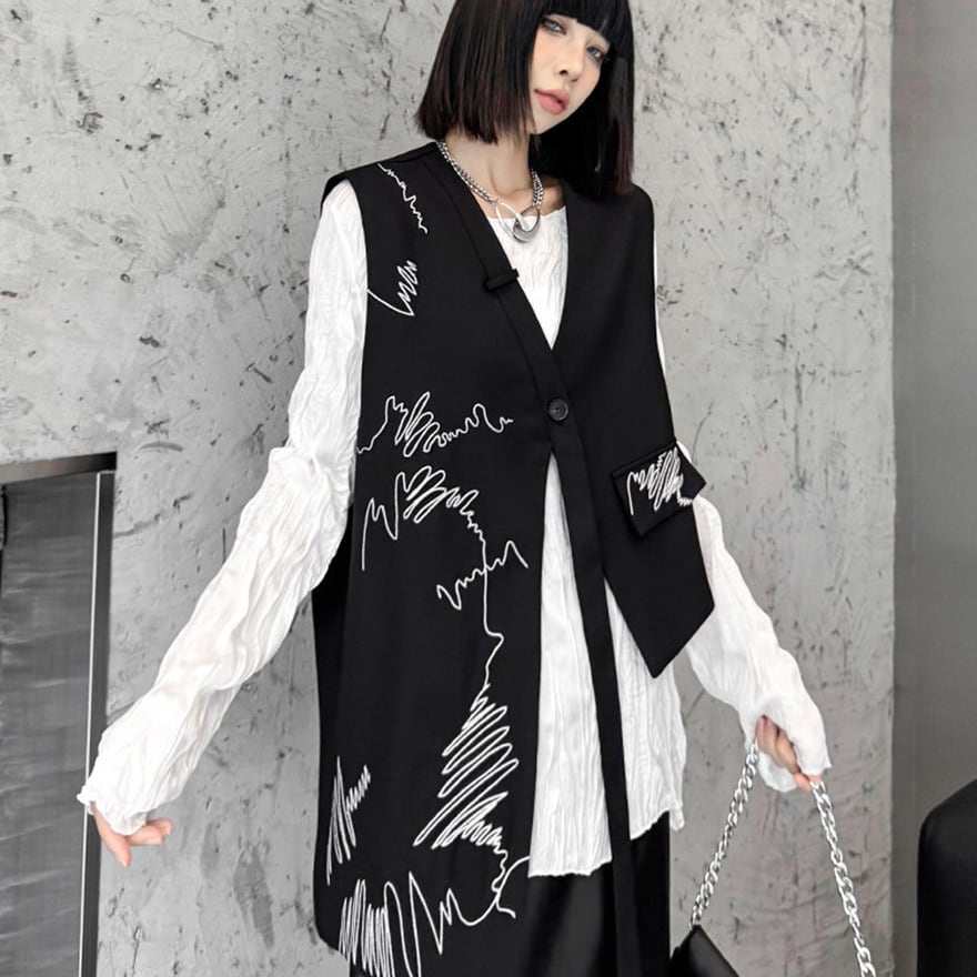 色は黒で、白の線画風の刺繍またはプリントが施されています。Vネックの襟元にボタンが一つ配置され、裾は左右非対称(アシンメトリー)な形状です。