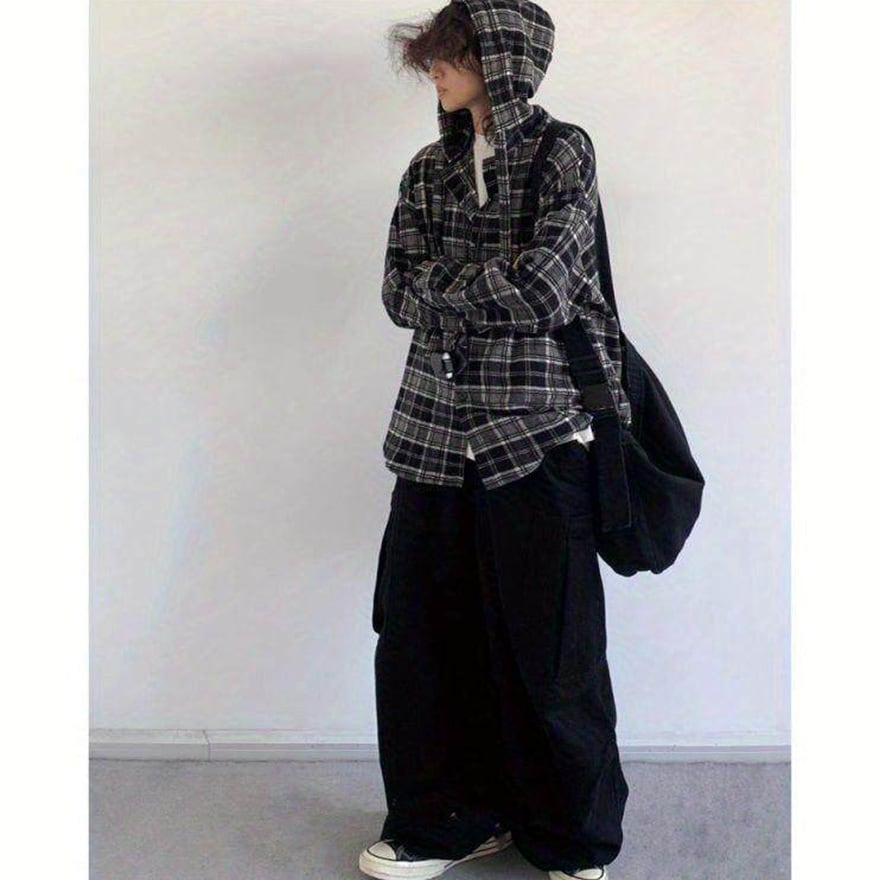 黒、白、グレーで構成されたモノトーンのチェック柄が特徴です。ゆったりとしたオーバーサイズなシルエットで、性別を問わず着用可能です。