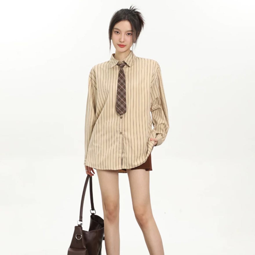 サブカル系ジャンルの長袖シャツとネクタイのセットです。ベージュ系の生地に濃色の垂直な縞模様が施されたデザインが特徴です。