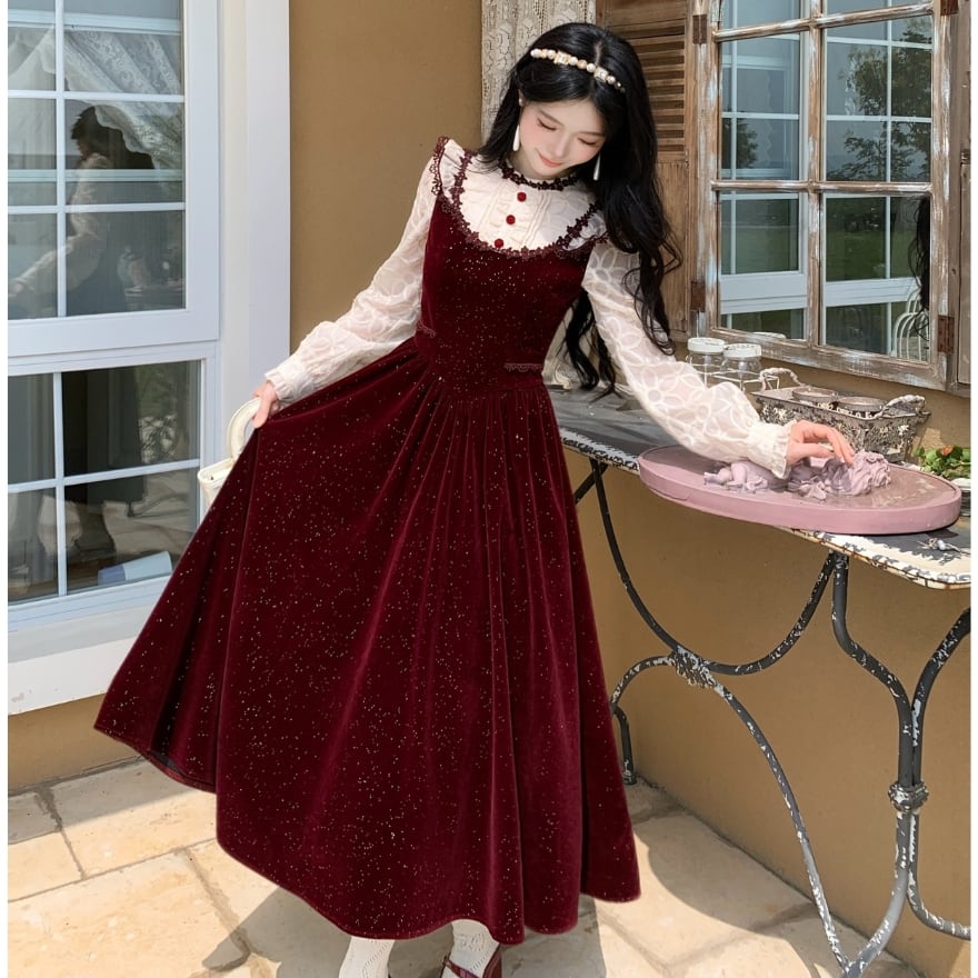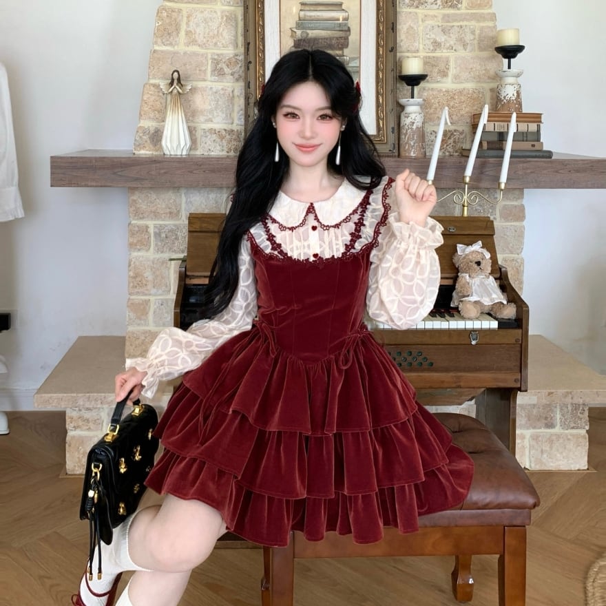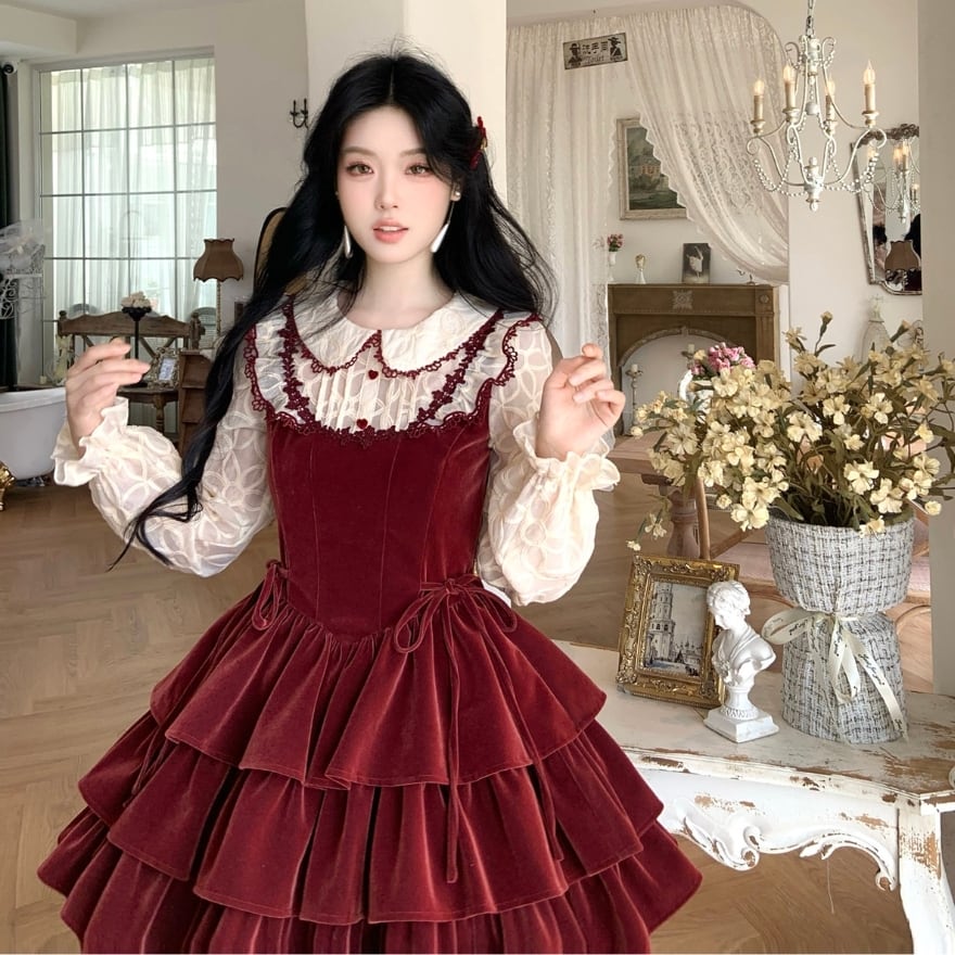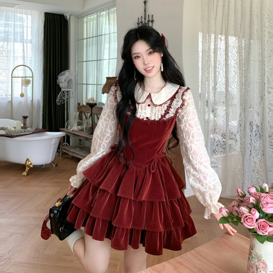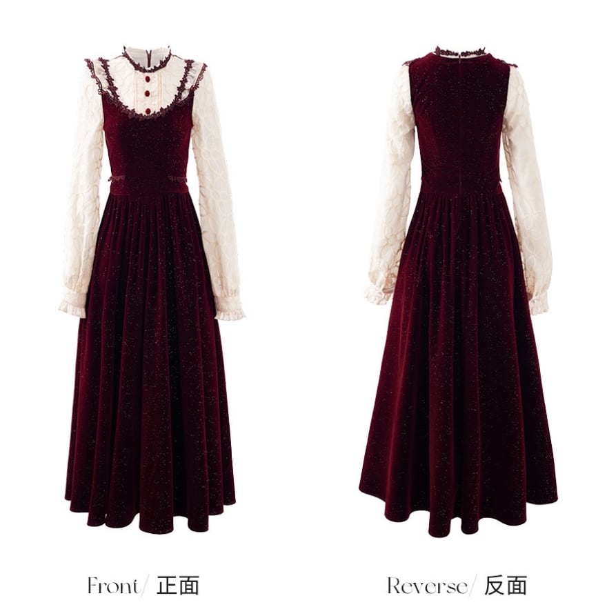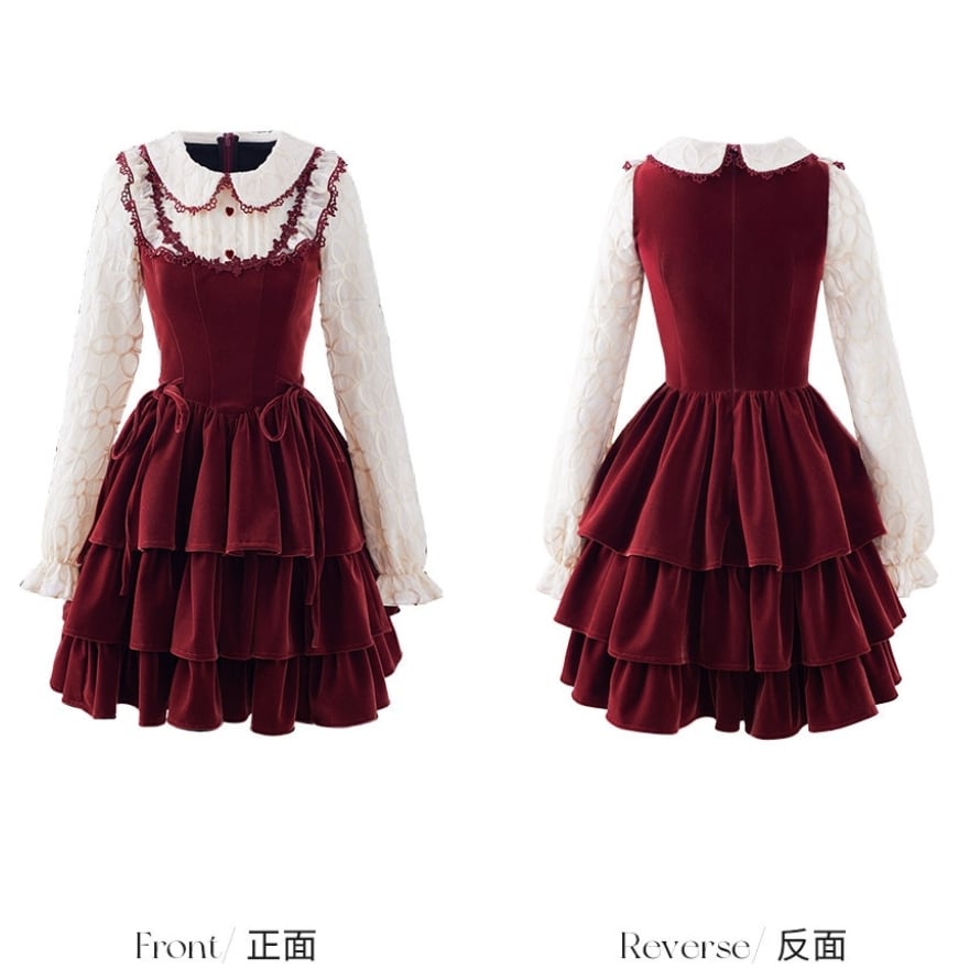 ロリィタを着たいけれど、甘すぎる配色だと少し気恥ずかしい。そんな方でも取り入れやすい一枚です。白襟とフリルで可憐さを残しつつ、全体は深いボルドーでまとめているので、かわいさと落ち着きをどちらも欲しい日に選びやすい。しかも2丈展開だから、自分のなりたい雰囲気に寄せやすいのも大きいです。