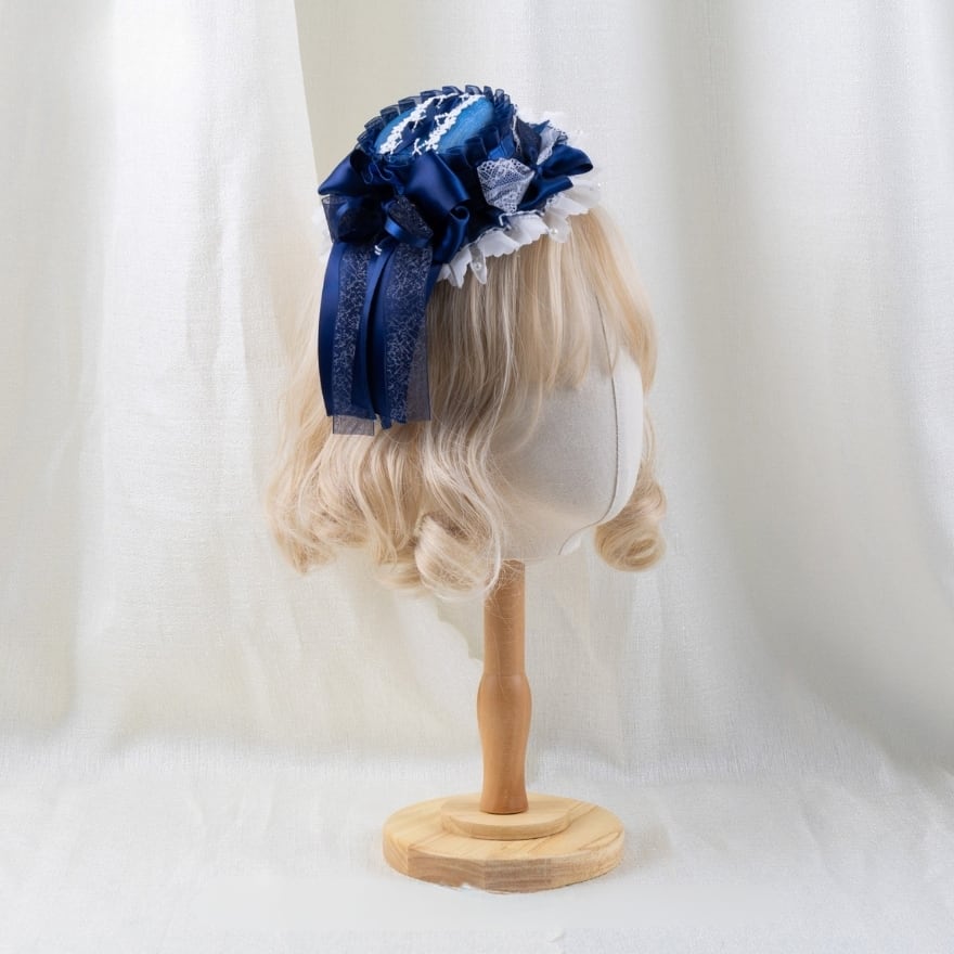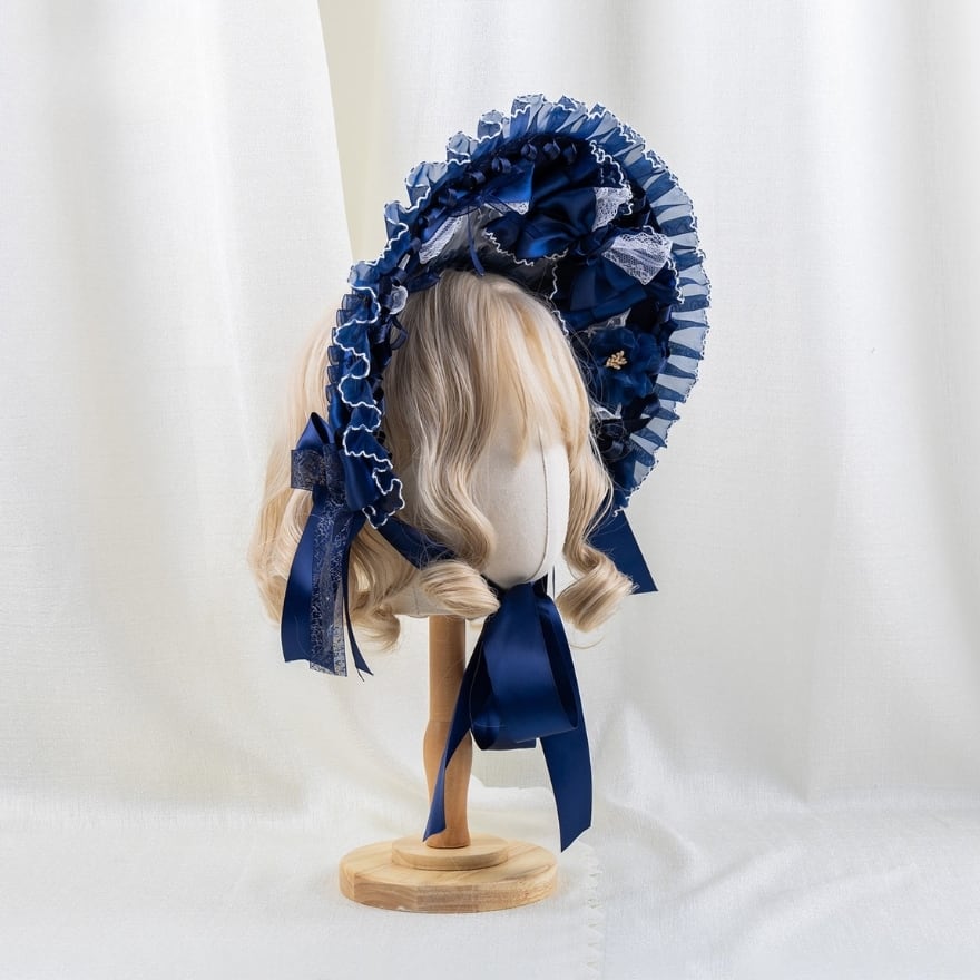 ネイビーの重なりフリルとリボン、繊細なレース使いが特徴で、お茶会や撮影会コーデに最適です。顔まわりをぐるりと包むように華やかさが出るので、ワンピースに合わせた瞬間、コーデ全体の物語感が一段深まります。