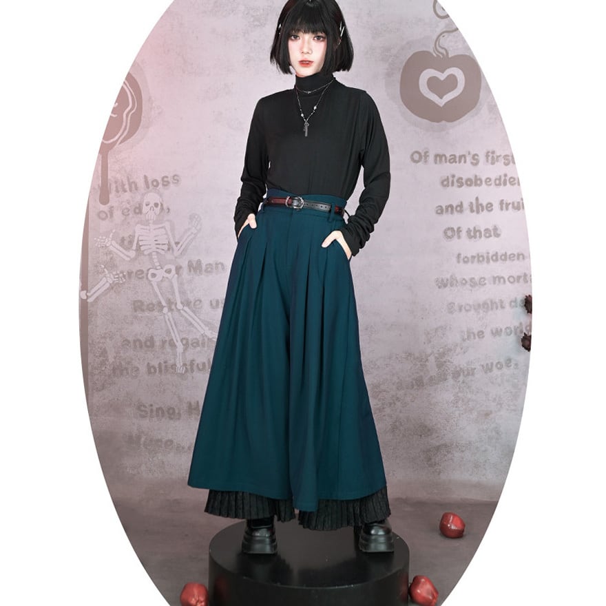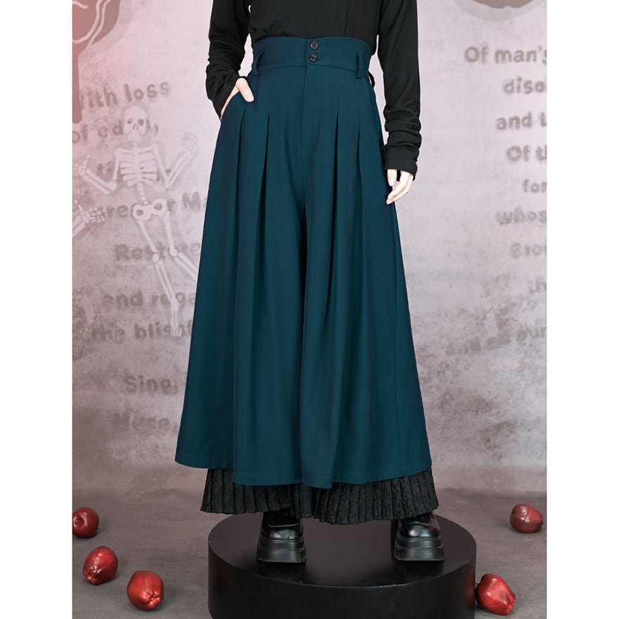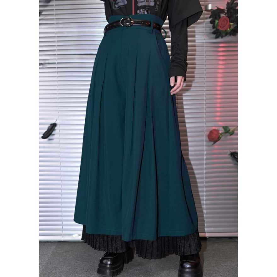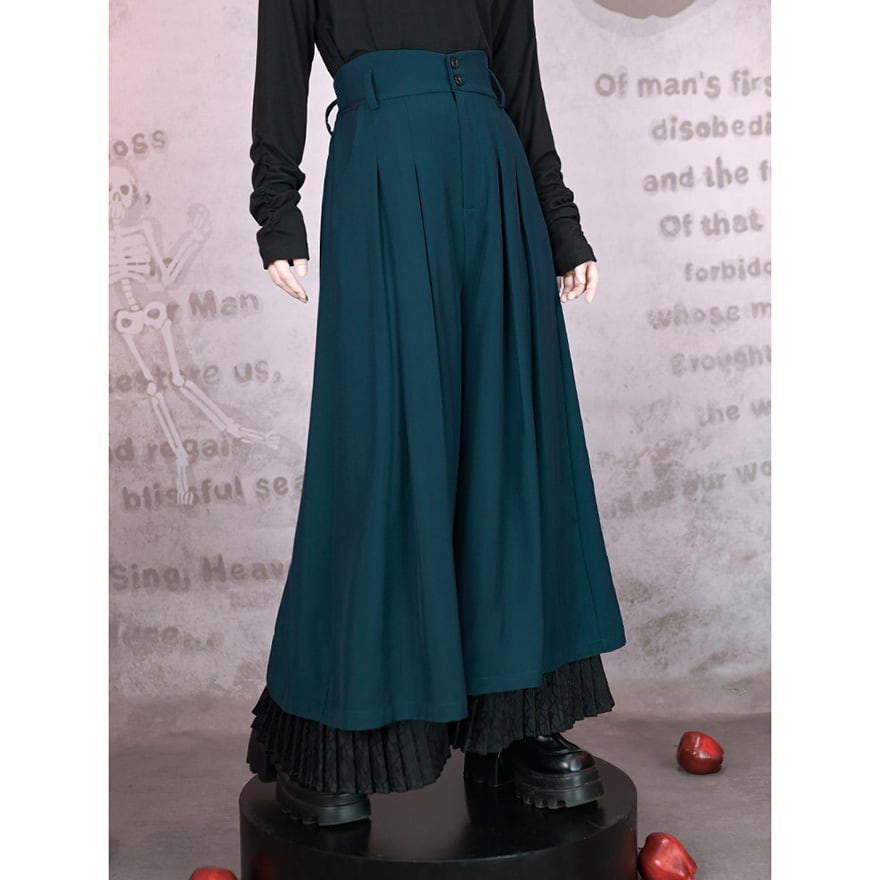 サブカル系ジャンルのワイドレッグパンツです。深緑色の本体と、裾部分に黒いプリーツ生地を重ねた二層構造が特徴です。