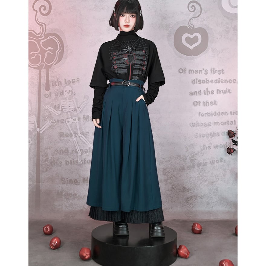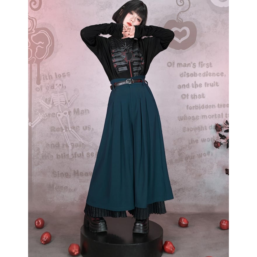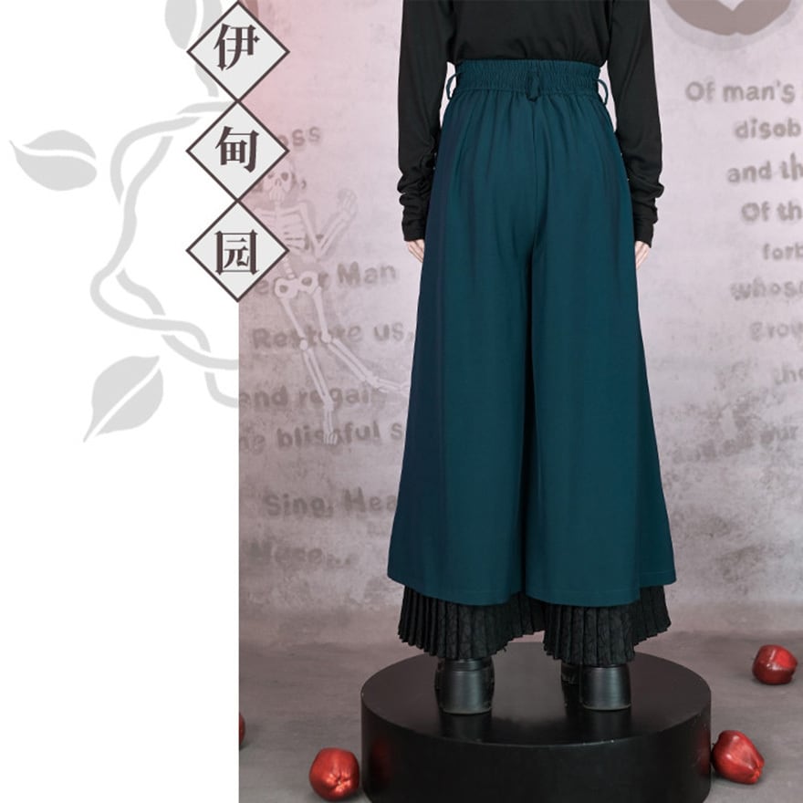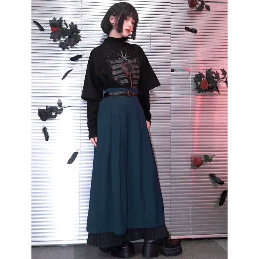 サブカル系ジャンルのワイドレッグパンツです。深緑色の本体と、裾部分に黒いプリーツ生地を重ねた二層構造が特徴です。