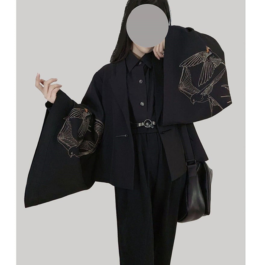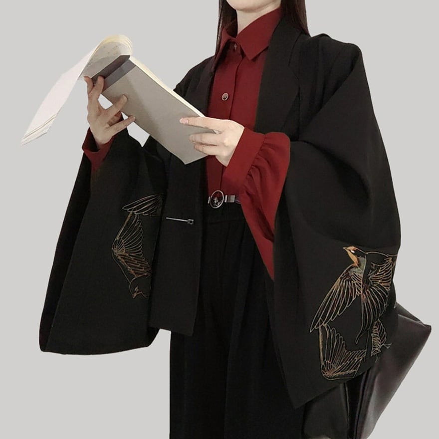 大きく丸みを帯びて広がる琵琶袖が最大のデザイン特徴です。襟元は端正な角襟で、前面はボタン留め仕様。白、黒、ワインレッドの三色があります。