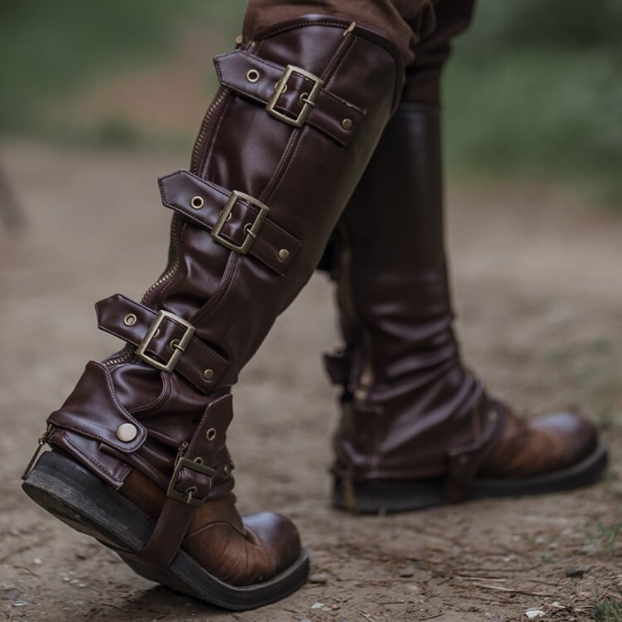 スチームパンク風ベルトデザインブーツカバーは、多数のバックルベルトを配した重厚感のあるデザインが特徴です。