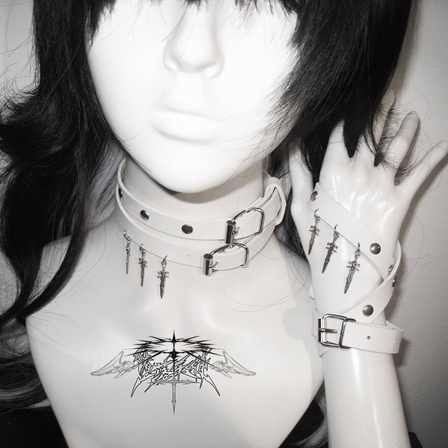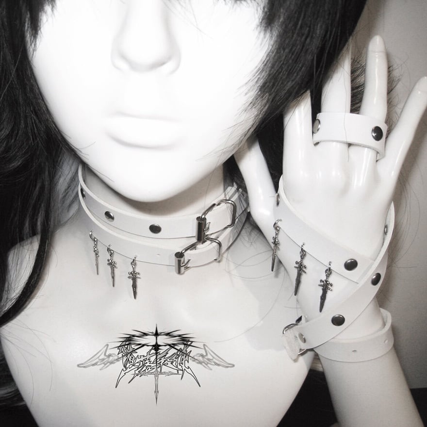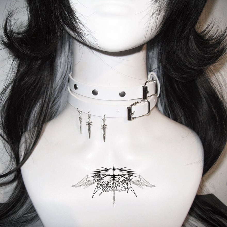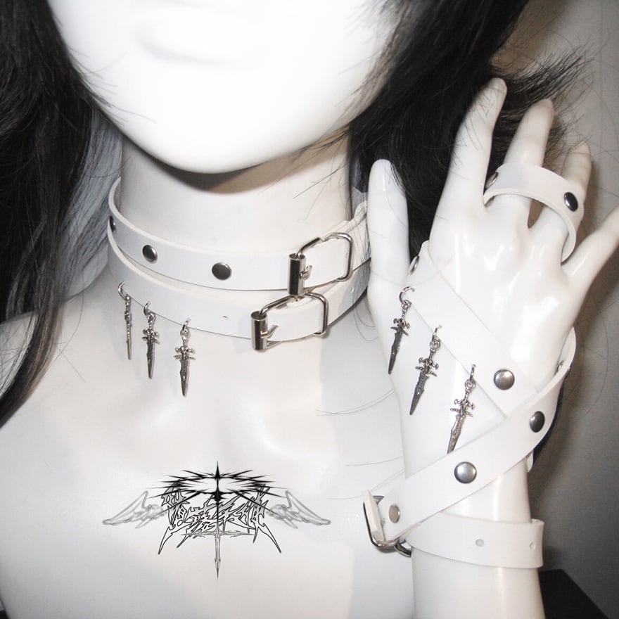 潔い白のベルトが首筋を綺麗に見せながらも、鋭利な剣のモチーフが内面の強さを引き出してくれるような、毒のある可愛さが魅力的なアクセサリーに仕上がっています。