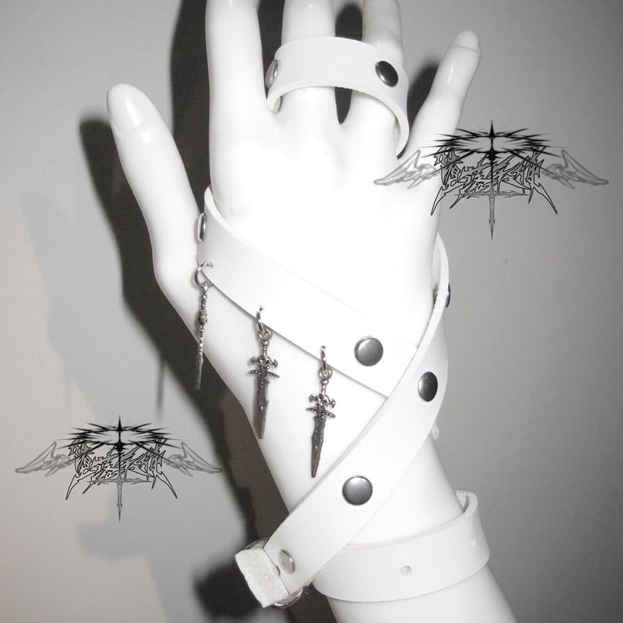 二連のベルトと剣のチャームが特徴で、地雷系やパンクコーデに最適です。