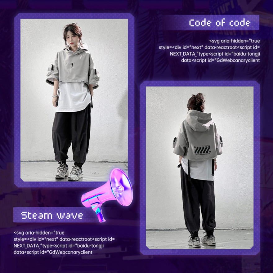 このジャケットはトレンドのショート丈を取り入れているので、手持ちのストリート系アイテムとも馴染みやすく、手軽にサイバー感をプラスできます。