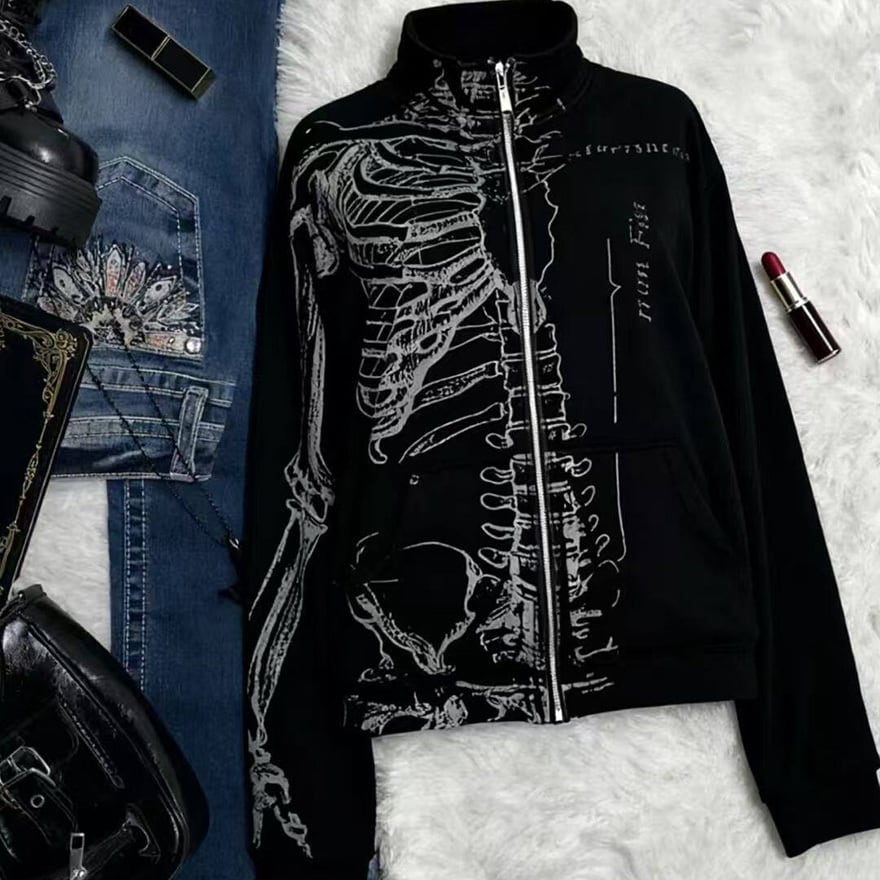 「普通の黒アウターでは地味すぎて物足りない」というお悩みも、この大胆な骨のプリントが解決してくれます。