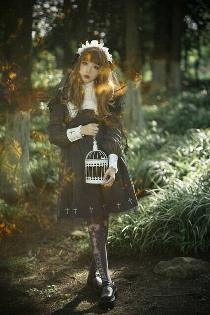 サブカル 服 地雷系 通販 ロリータ クラロリ ワンピース ミディアム丈 シフォン レース フリル 十字架 暗黒 闇 袖コン ゴシック