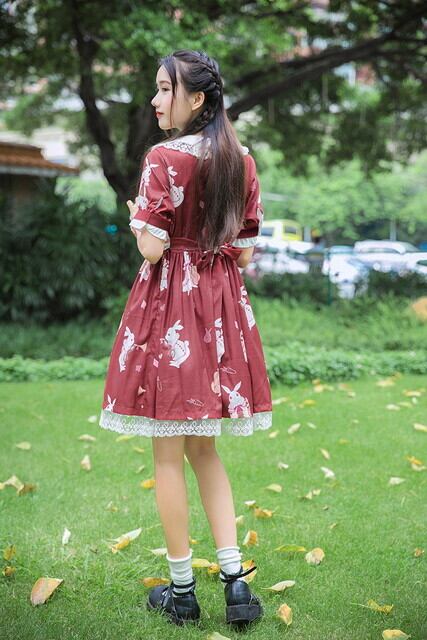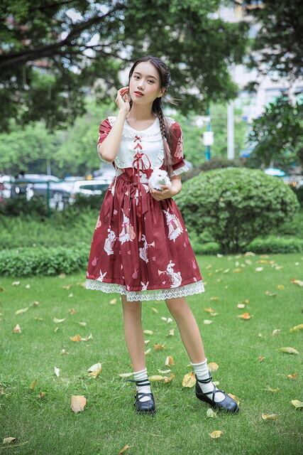 サブカル 服 地雷系 通販 ゴスロリ ワンピース 半袖 長袖 膝下 レース 袖コン 甘い お嬢様ワンピ ロリィタ 服 うさぎ ホワイト レッド ロリータ