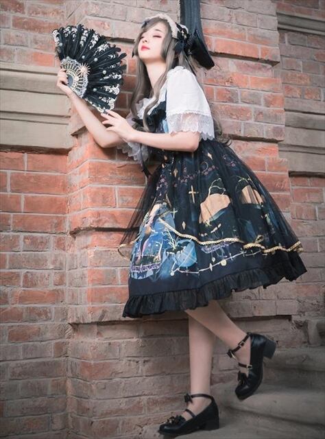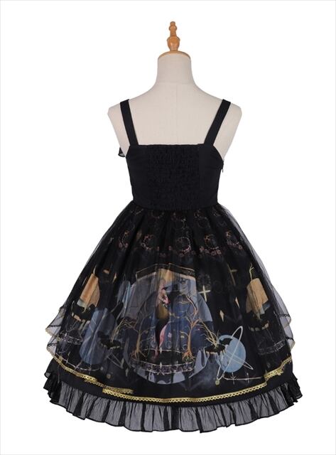 シフォンのレイヤースカートにウエストリボンの金モールがおしゃれな夢可愛いロリータワンピです。