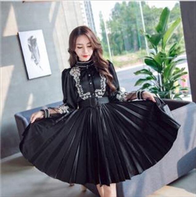光沢のあるブラックに花柄刺繍が病み可愛いワンピース。ネックにはギャザーのデザイン、袖口はレースがあしらわれてシックな大人のためのワンピースです。