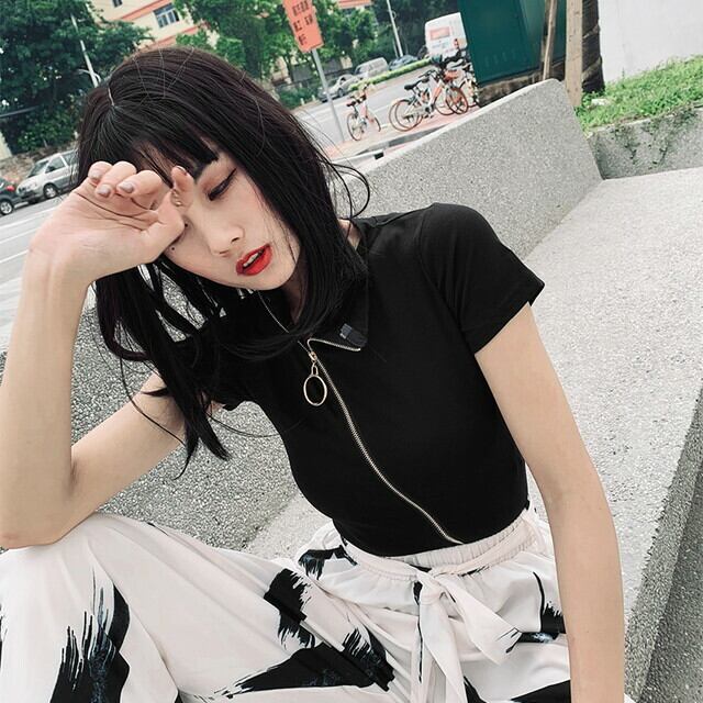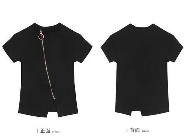 スタイリッシュな小悪魔的スタイルのアシンメトリーZIPアップTシャツ。