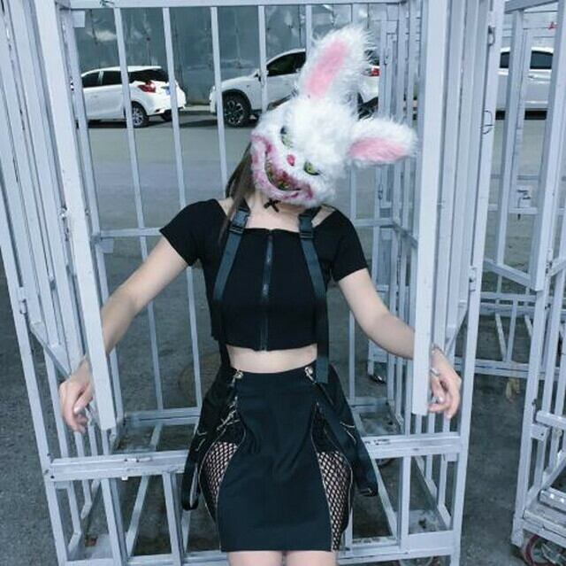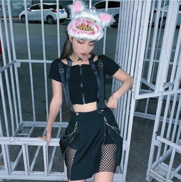サイドのメタルチェーンに十字架、ZIPから透けるメッシュがセクシーなショートスカート。