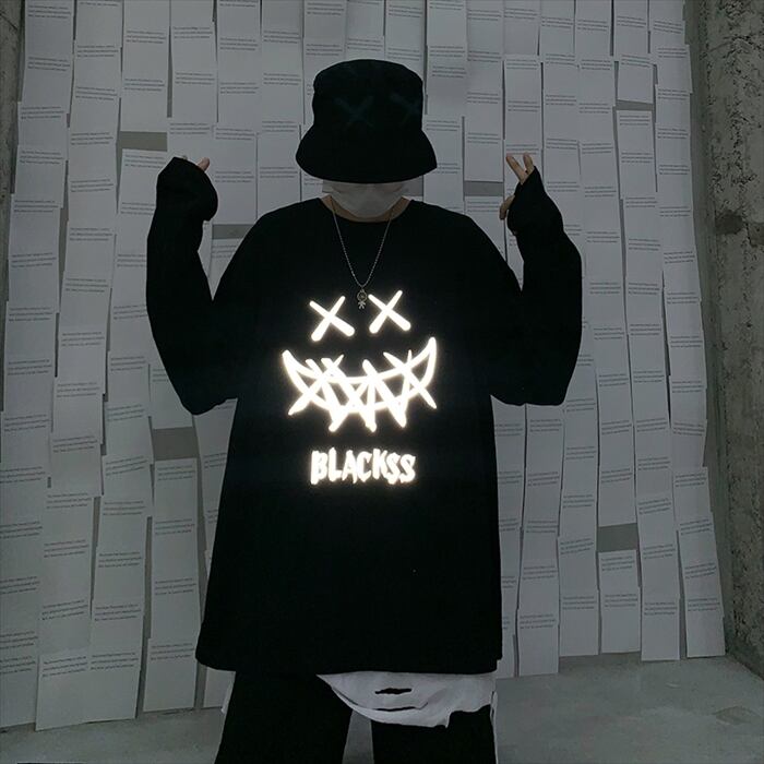 サブカル 服 地雷系 通販 ゴスロリ Tシャツ 長袖 ユニセックス プリント 反射ロゴ ブラック ホワイト ビッグシルエット ゆるふわサイズ オルチャン